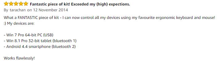 - Links use of a USB keyboard and mouse* between a PC and 2 Bluetooth devices