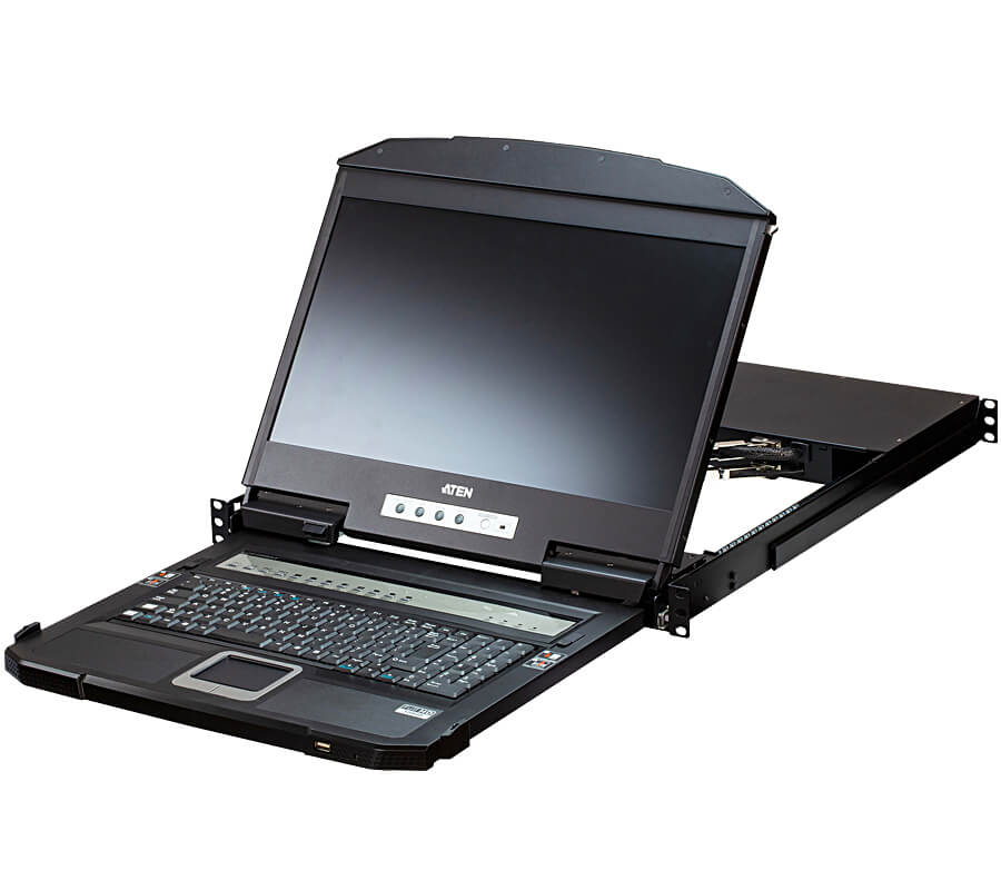The ATEN CL3884NW 4-Port USB HDMI Multi-View Dual Rail WideScreen LCD KVM Switch conserves space and enhances functionality for local server room management.