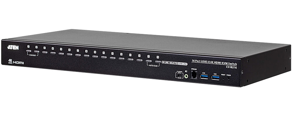 The ATEN CS18216 16-Port USB 3.0 4K HDMI KVM Switch features superior 4K video quality, USB 3.0 peripheral agility, and space-saving rackmount capability for streamlined local operations at the edge.
