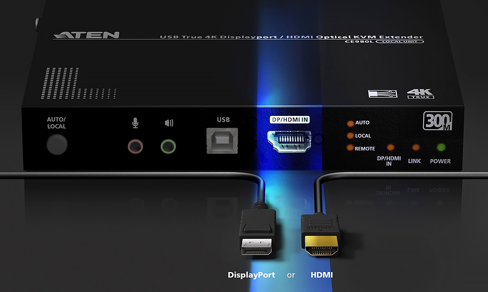 The ATEN CE980’s DisplayPort/HDMI combo connector enables flexible video connectivity at both ends – ideal for medical imaging setups with diverse, specialized equipment.