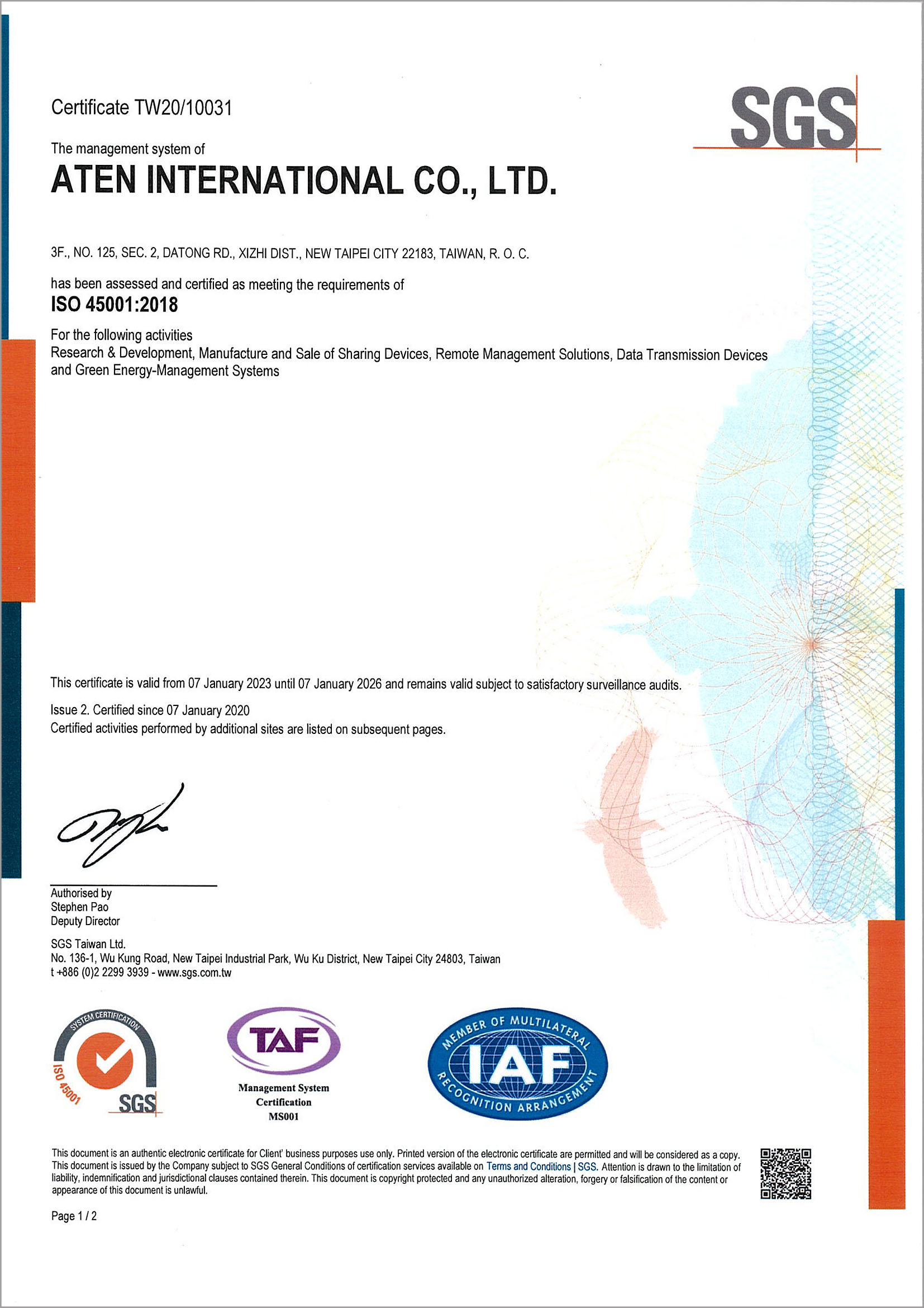 ATEN is committed to improving the safety management, and expects to strengthen self-management through the introduction and operation of the Occupational Health and Safety Management System, and continue to improve to provide a friendly and safe working environment. We commit: