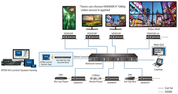 The Red Dot Design Award winner VE8950 along with the VE8900 provide an effective, easy-to-use, and economical digital signage solution with limitless scalability, flexibility, and daisy-chaining options. With no complicated IP setup and additional server PCs or software needed, these solutions are perfectly designed to address the challenges that system integrators encounter while implementing AV over IP systems. Engineered to meet today’s demands for large scale, multi-display, 1080p/4K signal transmission, and designed to be easy to set up and operate, the VE89 Series solutions are ideal for a wide range of environments, such as trade shows, airports, university campuses, conference centers, and shopping centers.