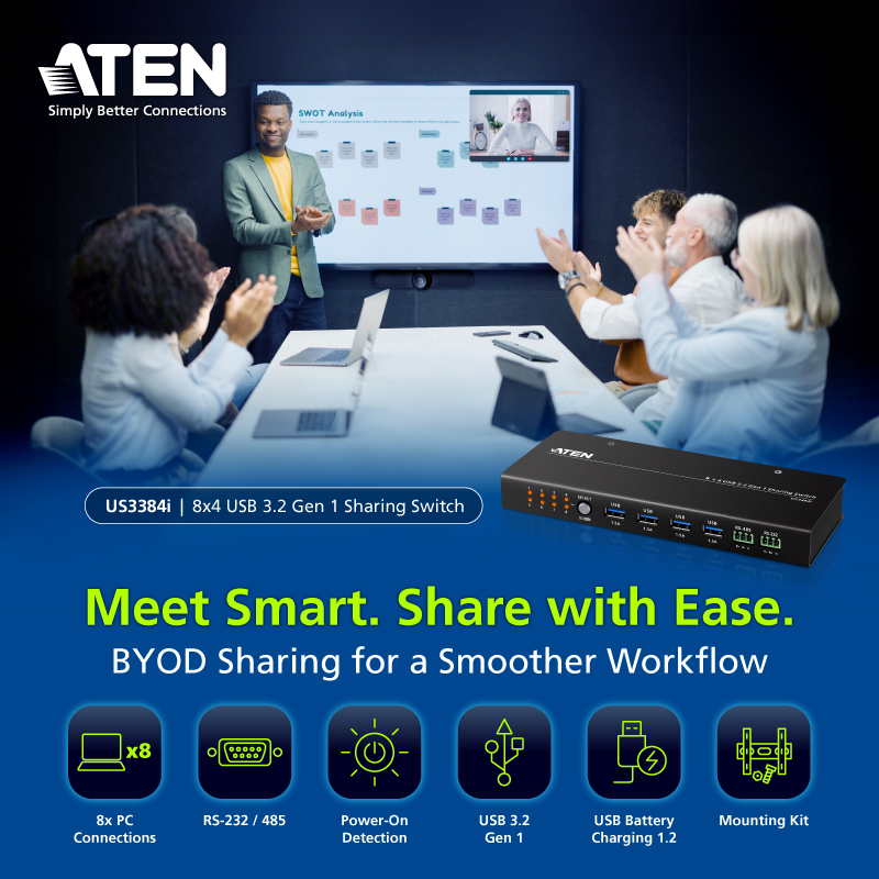 Taipei, Taiwan (Jan. 23, 2025) - ATEN International, the leading provider of KVM and AV/IT connectivity and management solutions, today announces the launch of the US3384i – an 8 x 4 USB 3.2 Gen 1 Sharing Switch. This innovative device enables seamless connections to up to 8 PCs or laptops and allows the sharing of up to 4 USB 3.2 Gen 1 devices, offering industry-leading cost efficiency solution and significantly enhancing the BYOD/BYOM experience. With blazing-fast data transmission, cross-platform compatibility (Windows, macOS, Linux), and flexible port-switching, the new ATEN US3384i USB sharing switch streamlines meeting workflows, boosts collaboration, and reduces IT procurement and management overhead for workplaces. Perfectly suited for a wide range of meeting spaces, it also excels in industrial control applications.