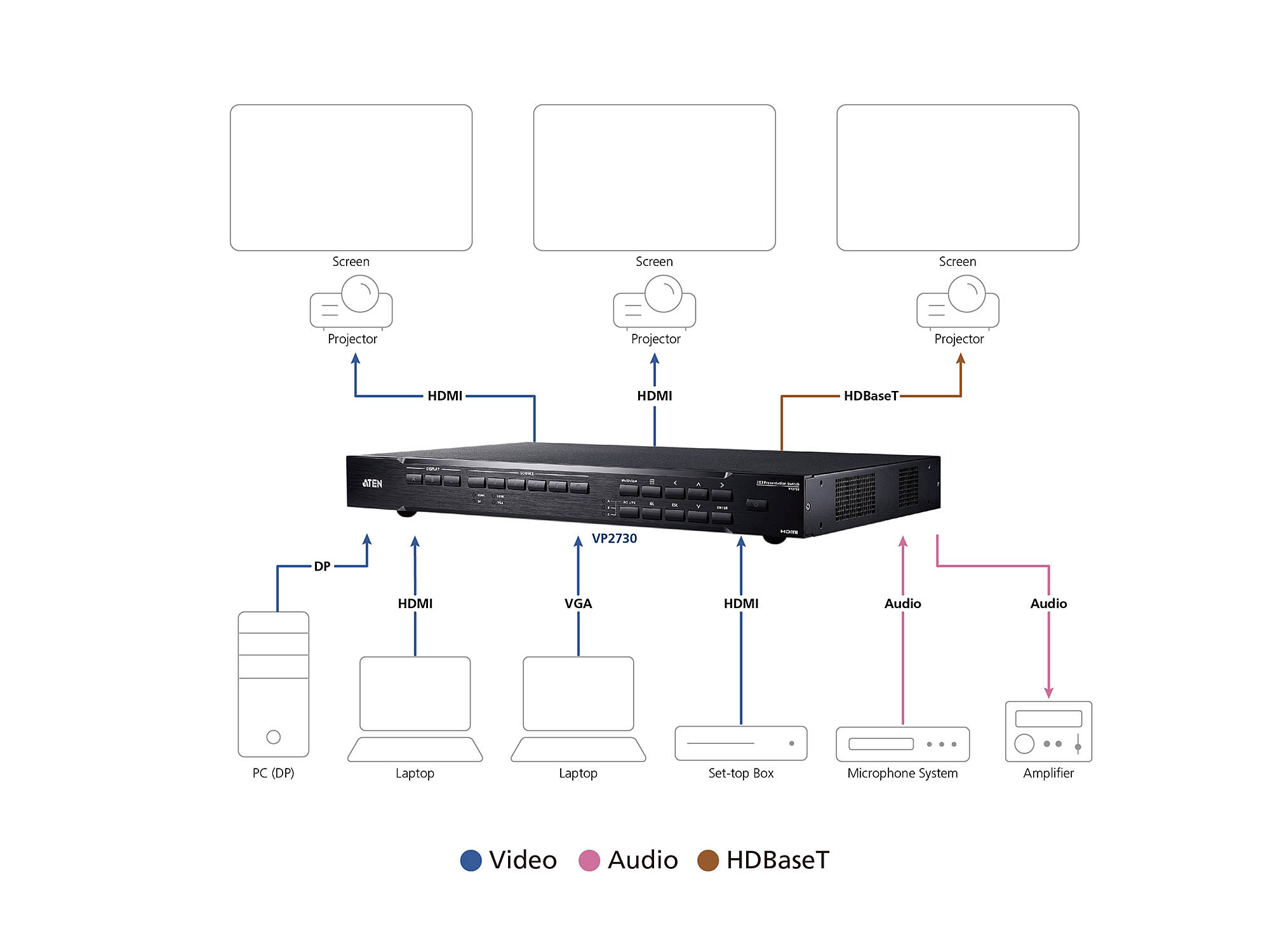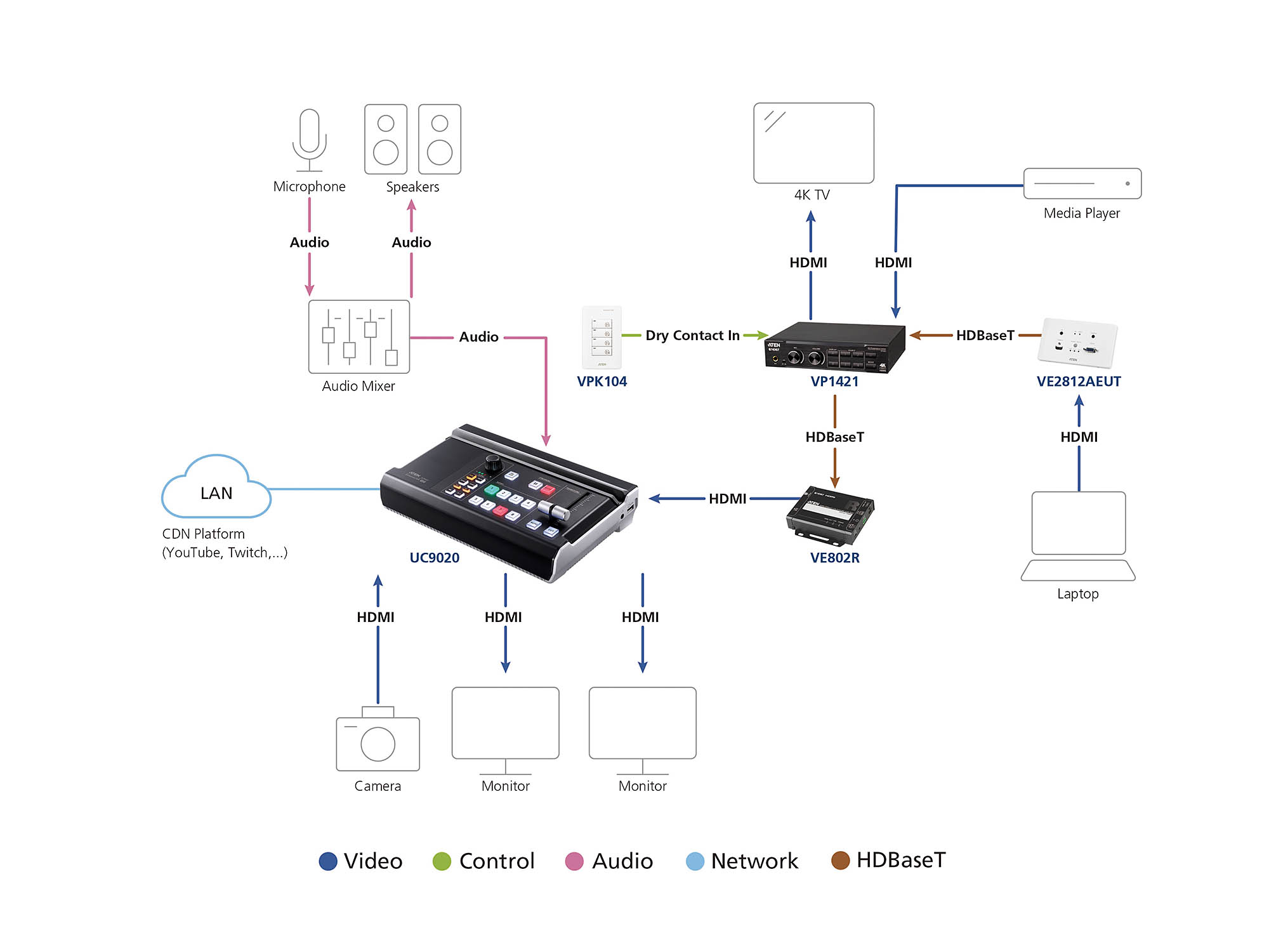 The ATEN audio system integrates fully with the ATEN VK control system, enabling streamlined management of audio, video, and other equipment through a single, scalable interface for improved usability and efficiency.