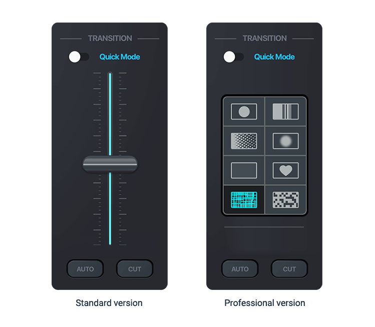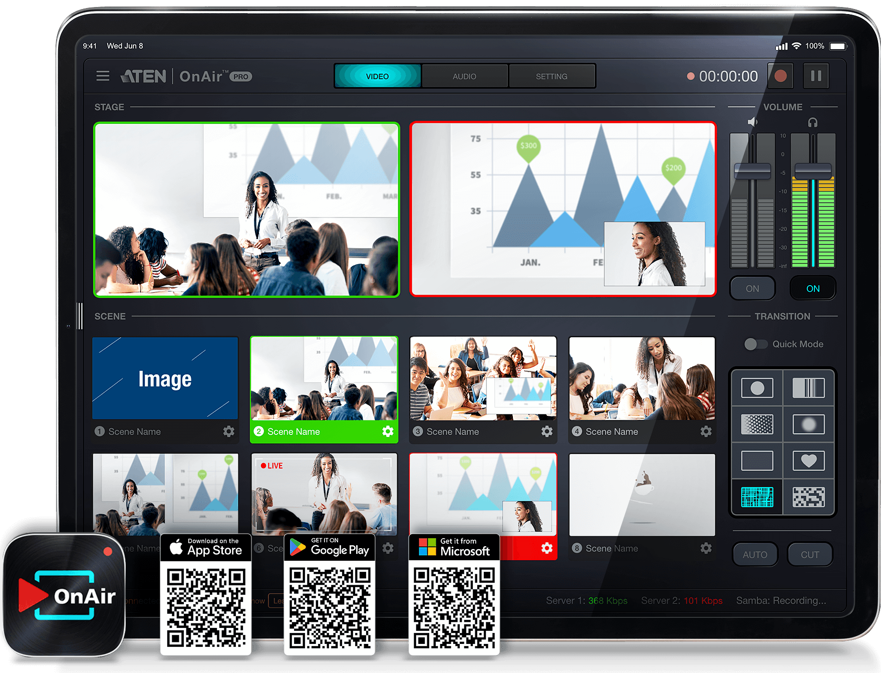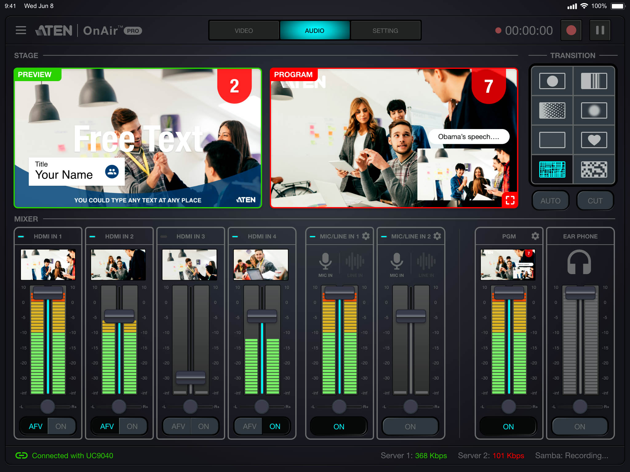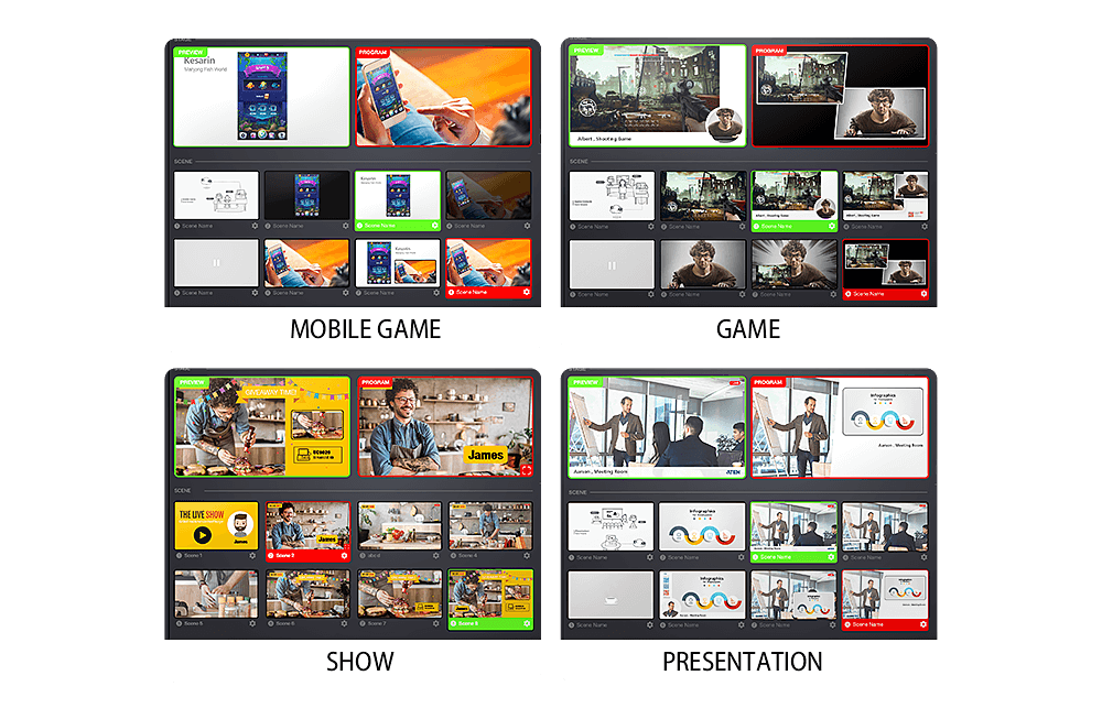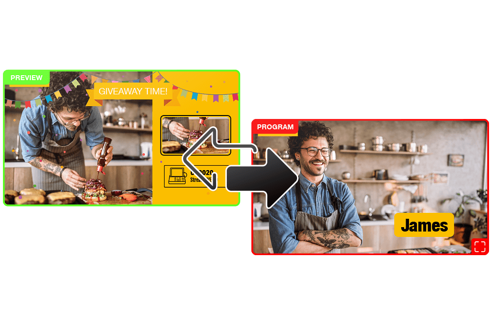 Program is the video feed that’s being livestreamed. Preview is the video feed that’s ready for livestreaming. Once you apply the transition, the Preview and Program will switch over, with the Preview becoming the Program and livestreaming out. This innovative design can prevent incorrect content from being accidentally aired.