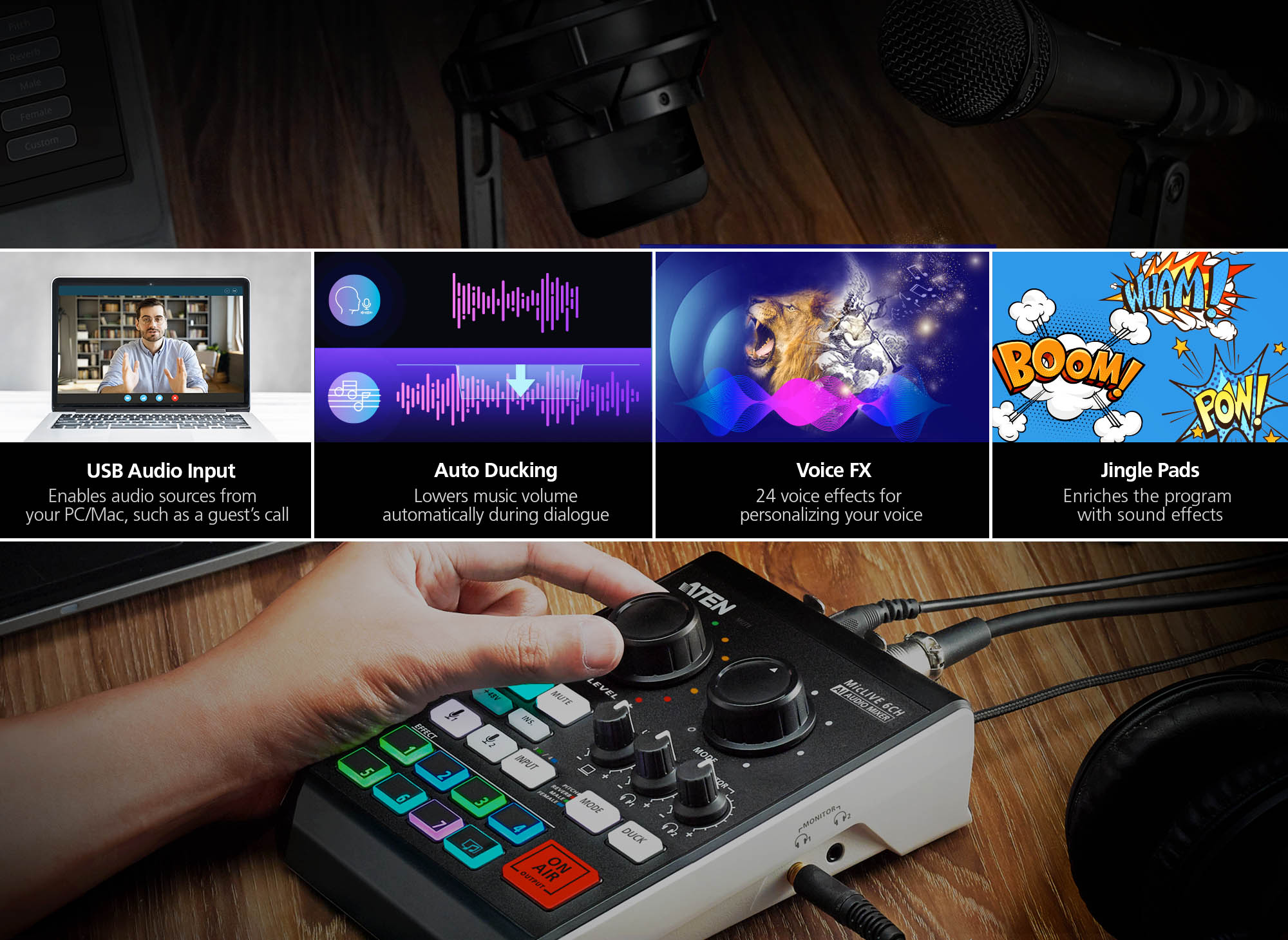 MicLIVE - 6-CH Podcast AI Audio Mixer is the industry’s first AI-optimized audio mixer that integrates a USB audio interface, voice effects processor, and sound effects pads. It adopts acoustic enhancement with its AI Smart-EQ to solve common recording issues and optimize the voice recording experience to simplify podcast production.