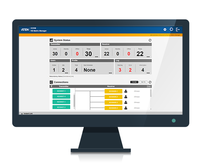 The KVM over IP Matrix Manager (CCKM) is a management software that allows you to define connections and manage, customize and control KVM over IP Extender pairings in a matrix configuration with features such as auto-detection of KVM over IP Extenders, username/password authentication, switching and sharing of connections, scheduling, permissions, and more. Whether you're extending computer access for monitoring, broadcasting, editing, or workstation setup, the KVM over IP Matrix System gives you the flexibility and control to manage one or hundreds of extended connections. Furthermore, you can take advantage of CCKM's Instant Link function to perform instant, real-time port and profile switching on an iPad. Simply download the Matrix Link app on an iPad and you're good to go.