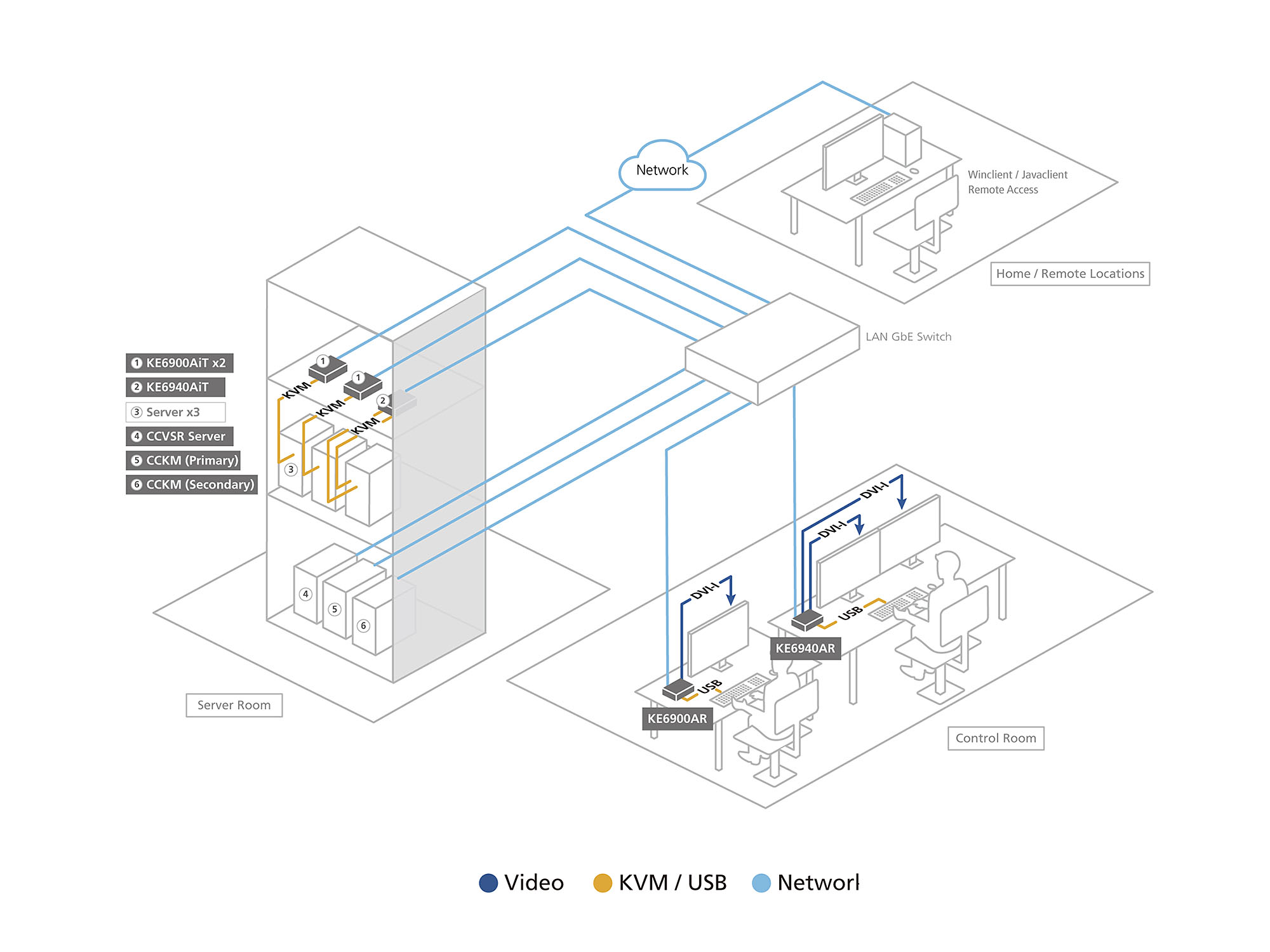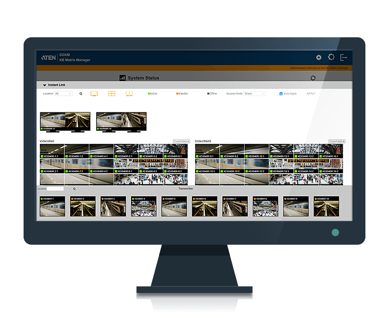The ATEN KVM over IP Matrix System combines KVM over IP Extenders with KVM over IP Matrix Manager (CCKM) to extend, control, monitor and access DisplayPort/HDMI/DVI-interfaced computers across an independent network with flexible configurations. Over IP solutions allow operators to be separated from servers, while secure, remote access is made easy, and servers remain centrally manageable.