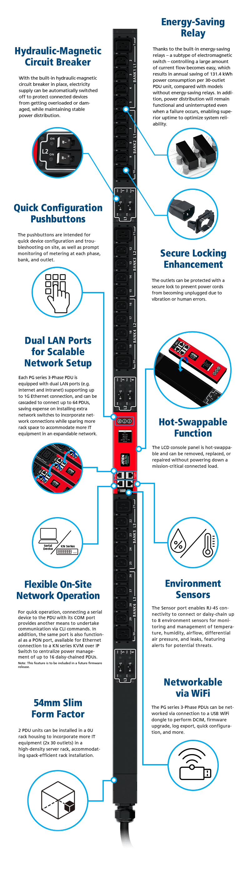 With network port redundancy, up to 64 PDUs can be cascaded via LAN ports, saving considerably on the expense for extra network switches while sparing rack space to incorporate more IT equipment in high-density server racks in an expandable network.