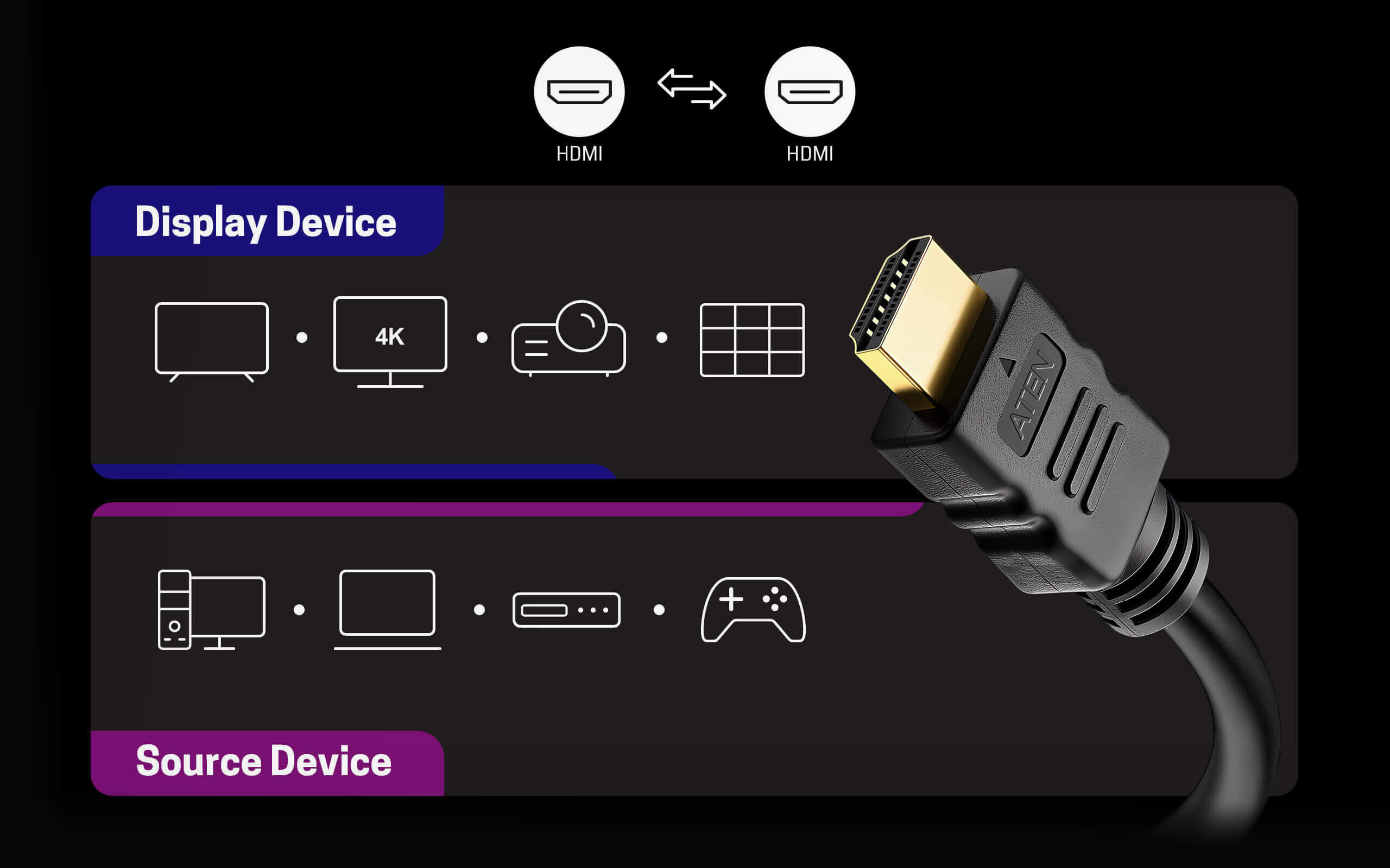 ATEN High Speed HDMI Cable with Ethernet provides an uncompressed, all-digital interface for both audio and video signals. Our cables infuse high-quality copper wire to resist interference for improved image clarity. We offer HDMI cable at lengths of 1 to 5 meters with resolutions up to True 4K (4096 x 2160 @ 60 Hz;3840 x 2160 @ 60 Hz 4:4:4).
