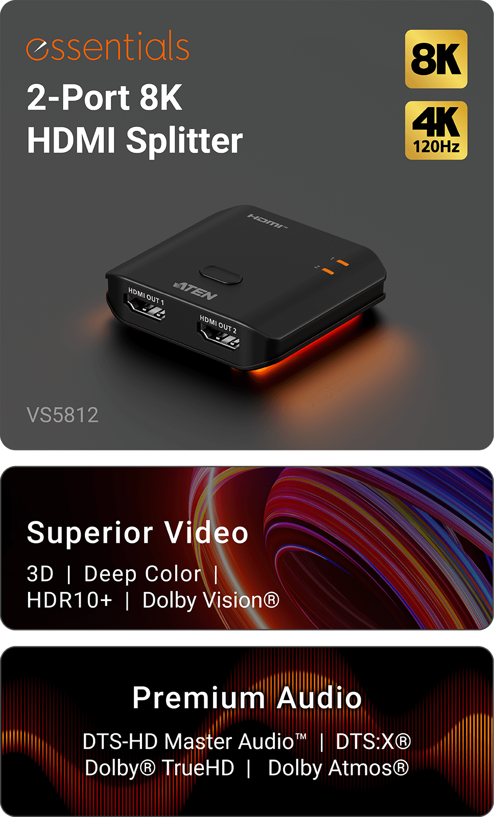 The VS5812 is a 2-Port 8K HDMI Splitter engineered to deliver state-of-the-art visual performance from a single source to dual displays. Compact, robust, and effortless to set up, the VS5812 is the perfect choice for premium home theaters, high-end gaming setups, professional studios, and commercial AV environments seeking uncompromised 8K performance. Supporting resolutions up to 4K@120Hz and 8K@60Hz, the VS5812 unlocks unprecedented clarity and detail, bringing ultra-realistic images to life with breathtaking sharpness and precision. Featuring EDID Sync™, the splitter ensures HDMI and HDCP 2.3-compliant visual brilliance at all times. Enjoy vivid, lifelike visuals with vibrant color depth, supported by HDR10+, Dolby Vision™, VRR (Variable Refresh Rate), ALLM (Auto Low Latency Mode), and Deep Color.