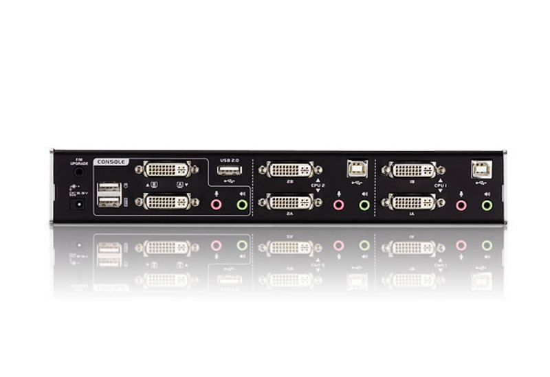 • 2-port DVI Dual View KVMP switch with USB 2.0 support and 2.1 channel surround sound audio
