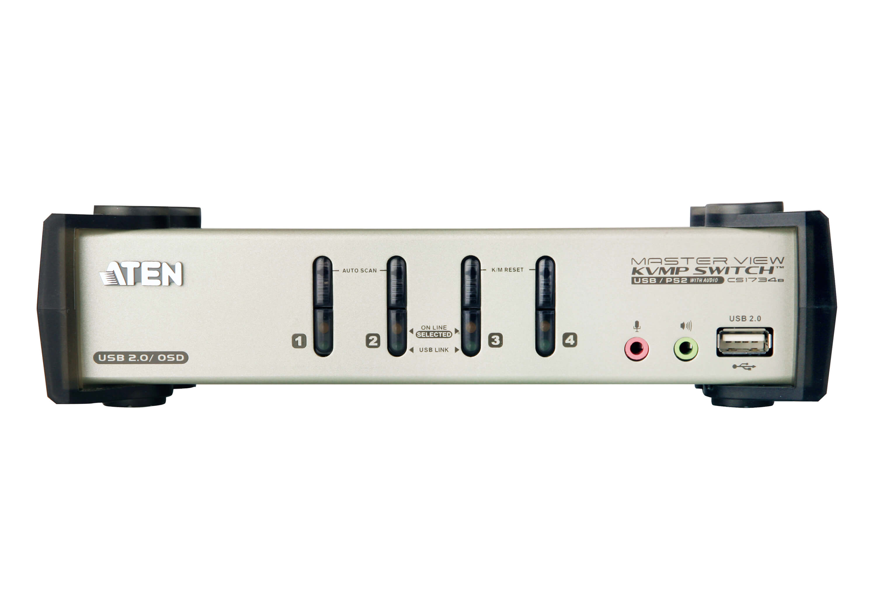 The CS1734B is 4-port KVM switch combined with a 2-port USB 2.0 hub. As a KVM switch, it allows users to access four computers from a single keyboard, monitor, and mouse console. There are four methods to obtain instant access to any computer in your installation: Pushbuttons, Hotkeys, OSD, and mouse.