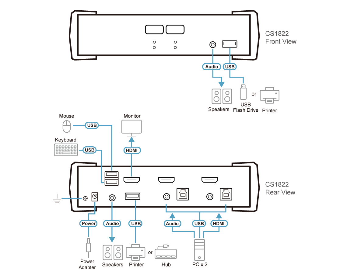 In addition, the CS1822 features Audio Mixer Mode which mixes audio sources from any two connected computers as audio output, benefiting users to be notified without missing any system alert even the KVM focus is set on other computers. With a built-in USB 3.1 Gen 1 hub, the CS1822 delivers data transfer rates up to 5 Gbps, allowing you to accelerate multimedia operations and share USB peripherals with ease.