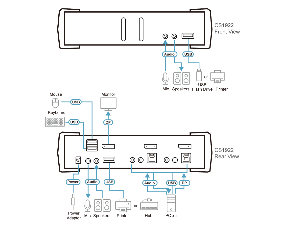 As a KVM switch, the CS1922 allows users to access two DisplayPort computers from a single USB keyboard, USB mouse and monitor console. Doing so with ease, the CS1922 provides three convenient switching methods – using front panel pushbuttons, mouse, or hotkeys for flexible access to any computer connected to the installation.