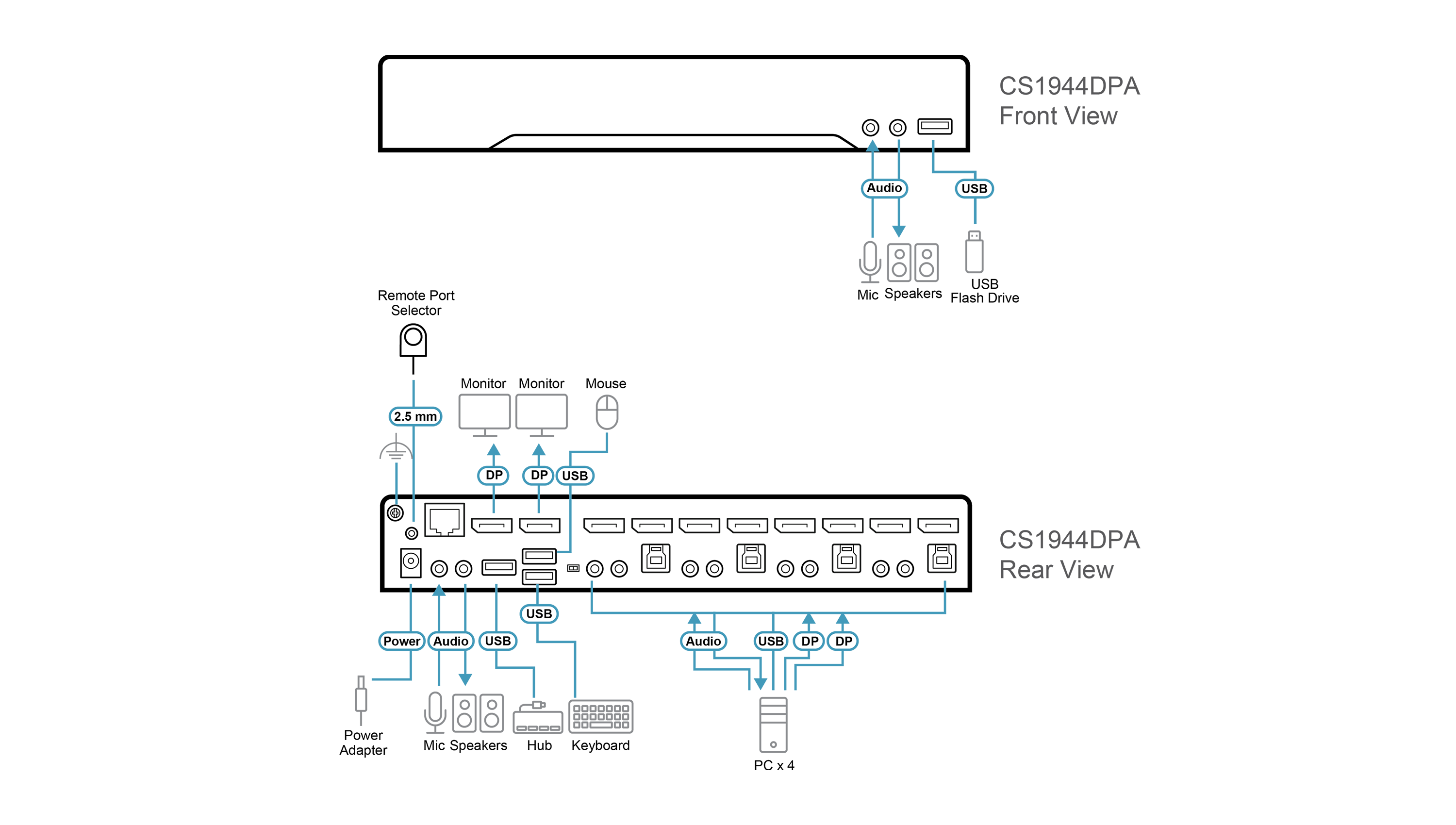 - One USB keyboard and mouse control two or four DisplayPort computers and share two USB peripherals