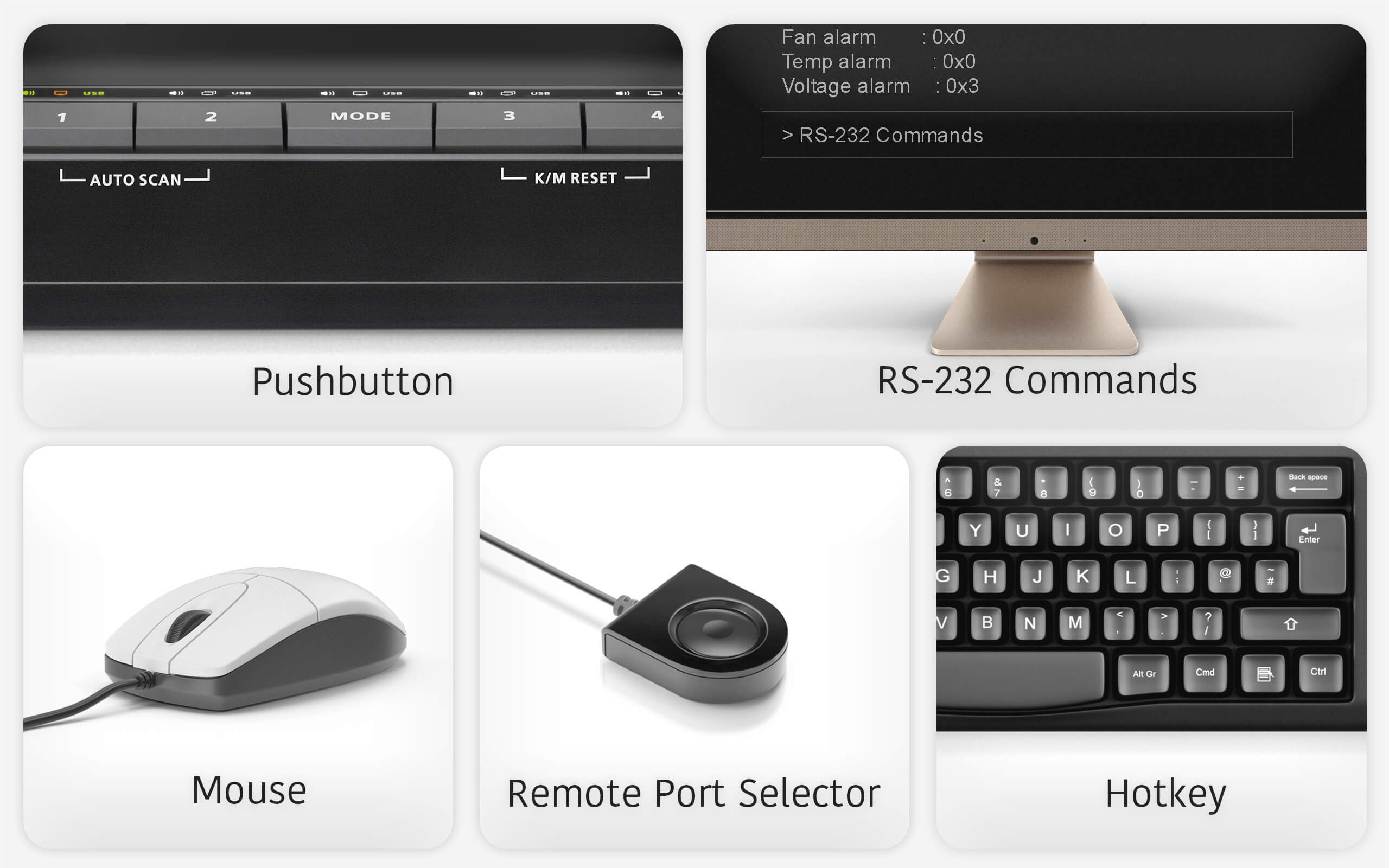 - Computer selection via pushbuttons, remote port selector, hotkeys, mouse4, and RS-232 commands