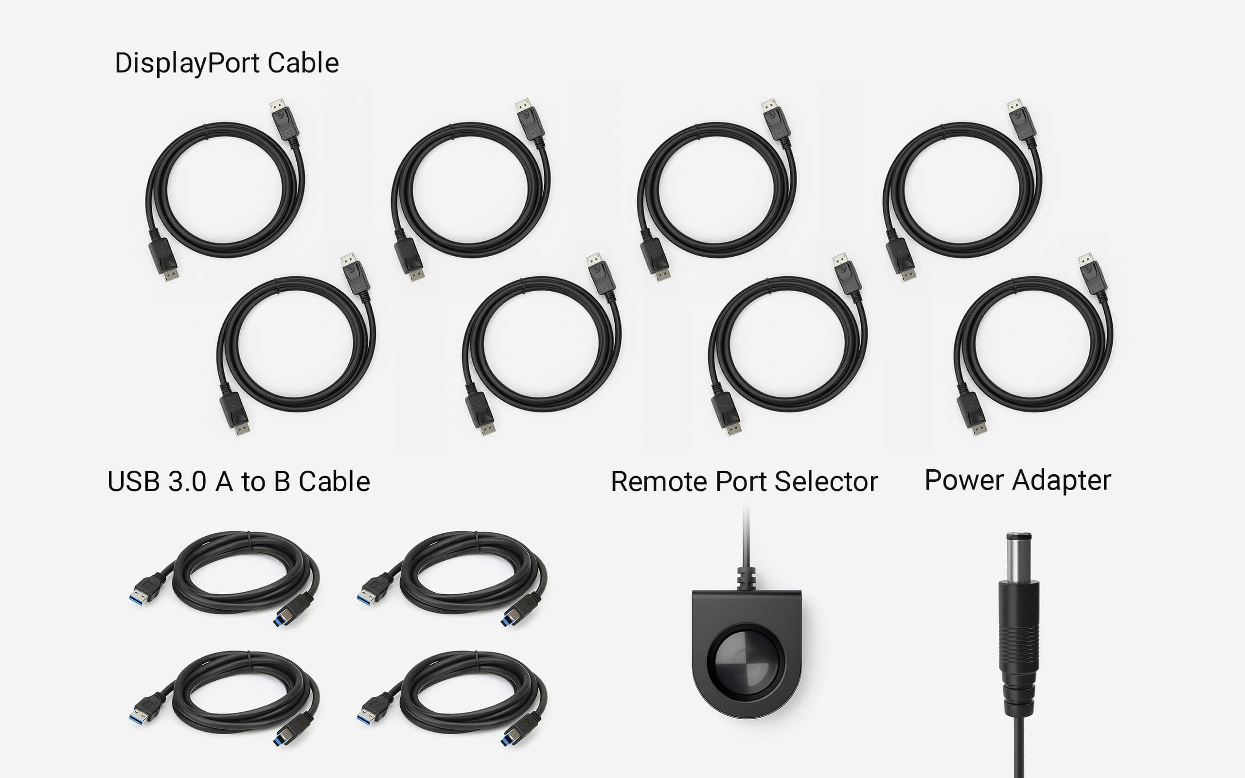 Everything you need is included – 8 DisplayPort cables, 4 USB 3.0 A to B cables, 1 power adapter, and 1 remote port selector (wired switch button) – for instant setup.