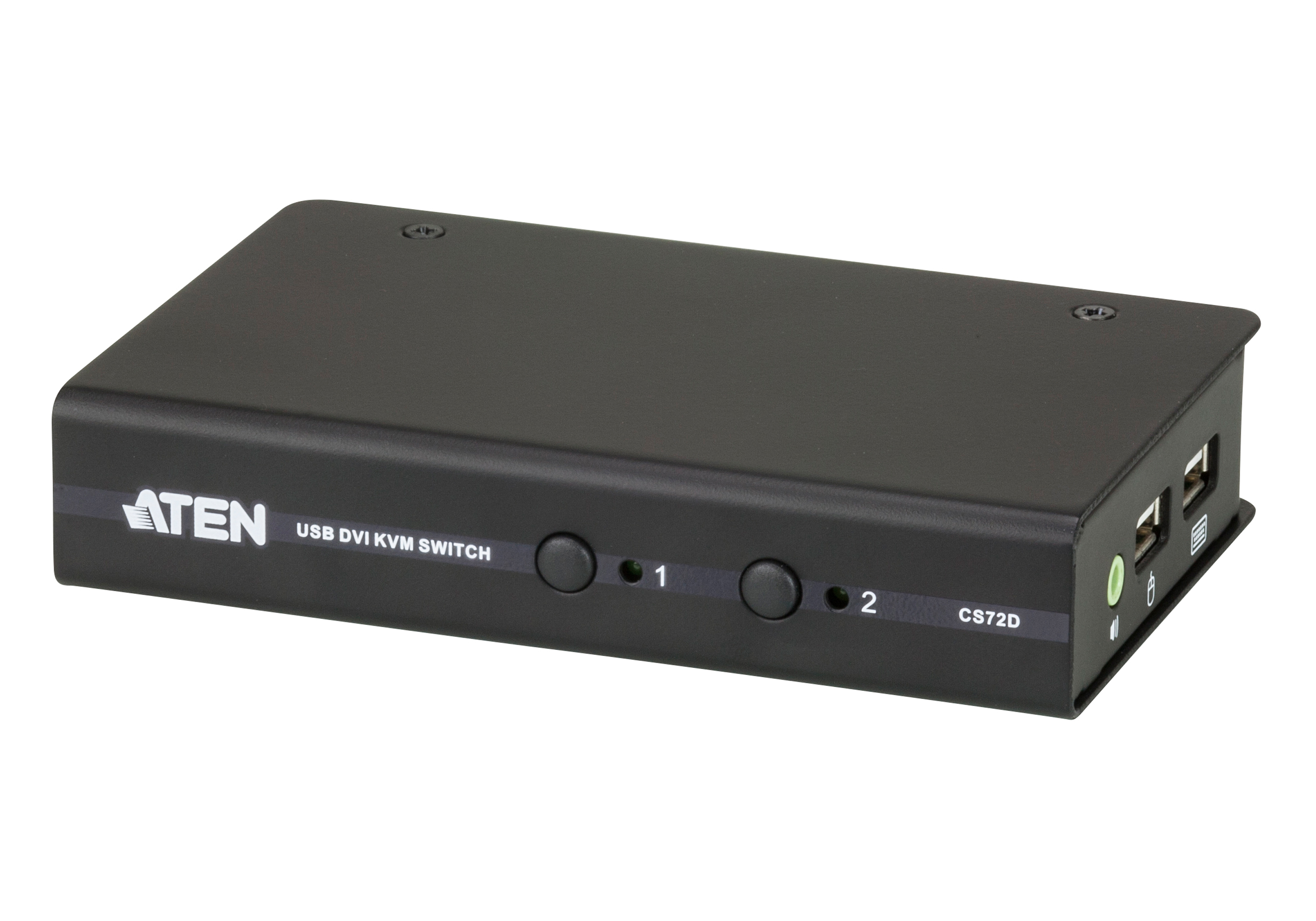 The CS72D 2-Port USB DVI KVM Switch allows you to control two computers using one USB mouse, USB keyboard and Digital Visual Interface (DVI) monitor console. It supports digital video devices, such as fl at panel displays, data projectors, plasma displays and digital TVs.