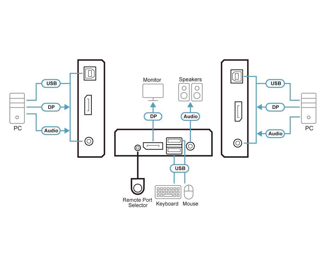 | KVM (Computer) Ports | 2 x USB Type B Female 2 x DisplayPort Female (Black) 2 x 3.5mm Audio Jack Female (Green) |