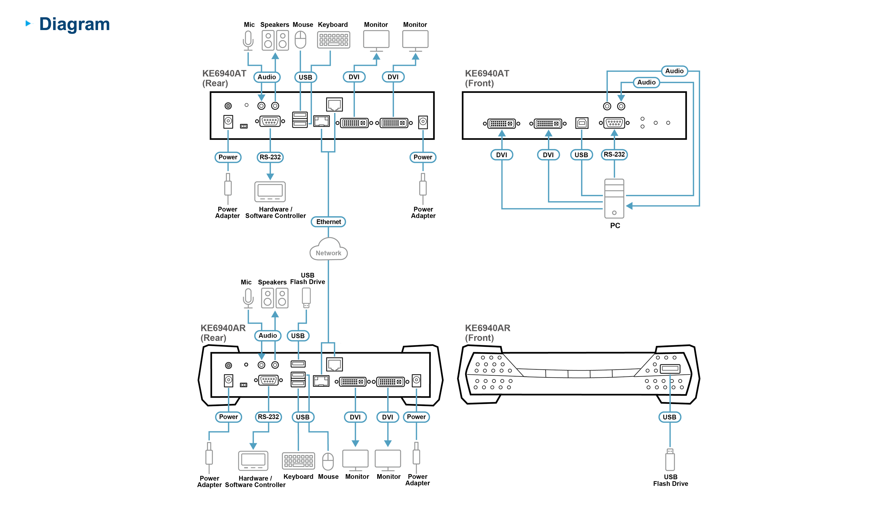 The KE6940A extenders are consisted of a high performance IP-based receiver (KE6940AR) that provides console access from a separate location. The KE6940A allows extended access of computer systems remotely via USB consoles (USB keyboard, USB mouse, DVI monitor) over intranet, enabling users to place the computer system in secure and temperature controlled environments, which maybe isolated from users’ workstation.