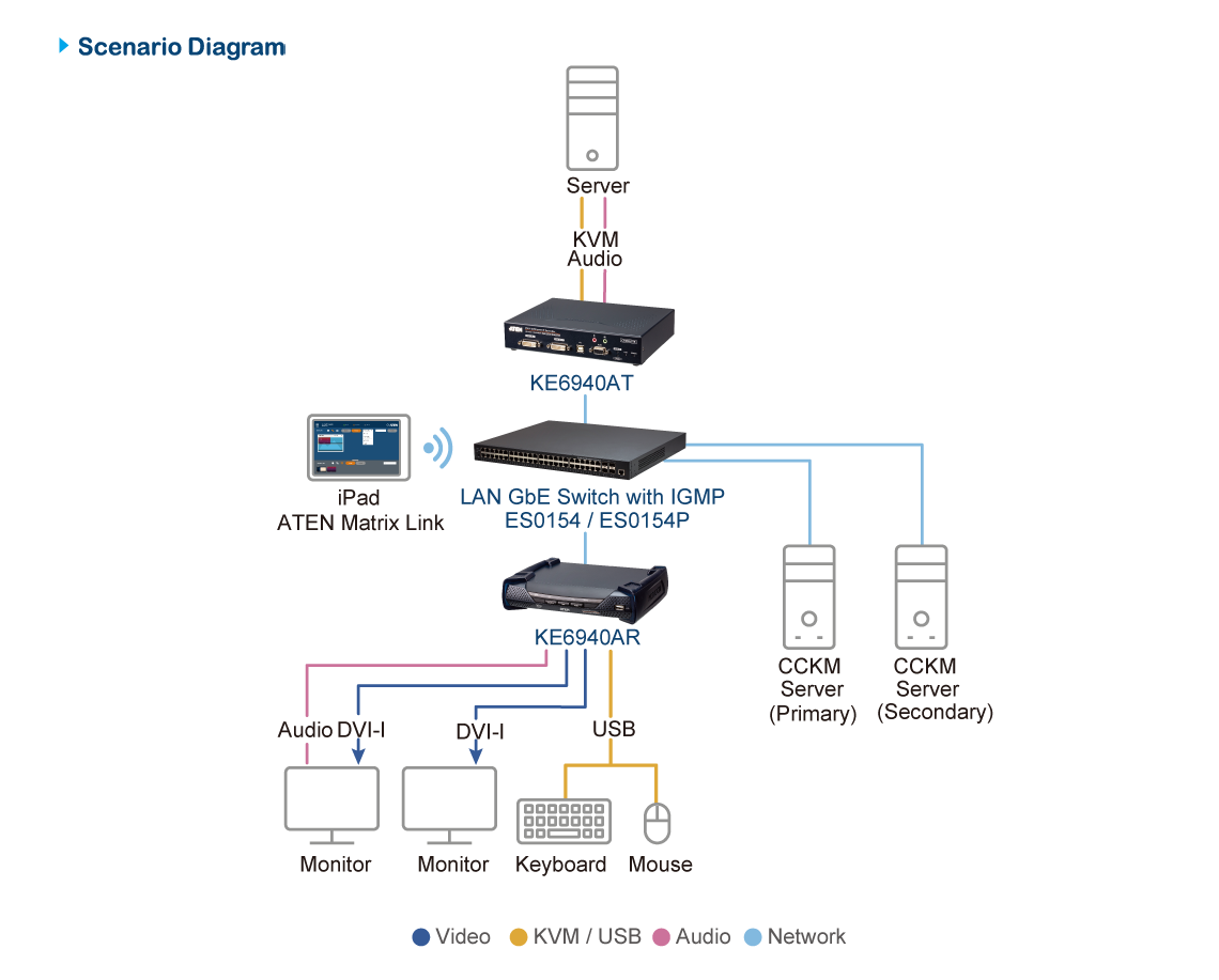 As an IP-based matrix extender, the KE6940A can be used as a point-to-point / point-to-multipoint / multipoint-to-point extender, or integrated into a KVM over IP Matrix System (multipoint-to-multipoint) when combined with the CCKM, providing more flexible applications in different working environments.