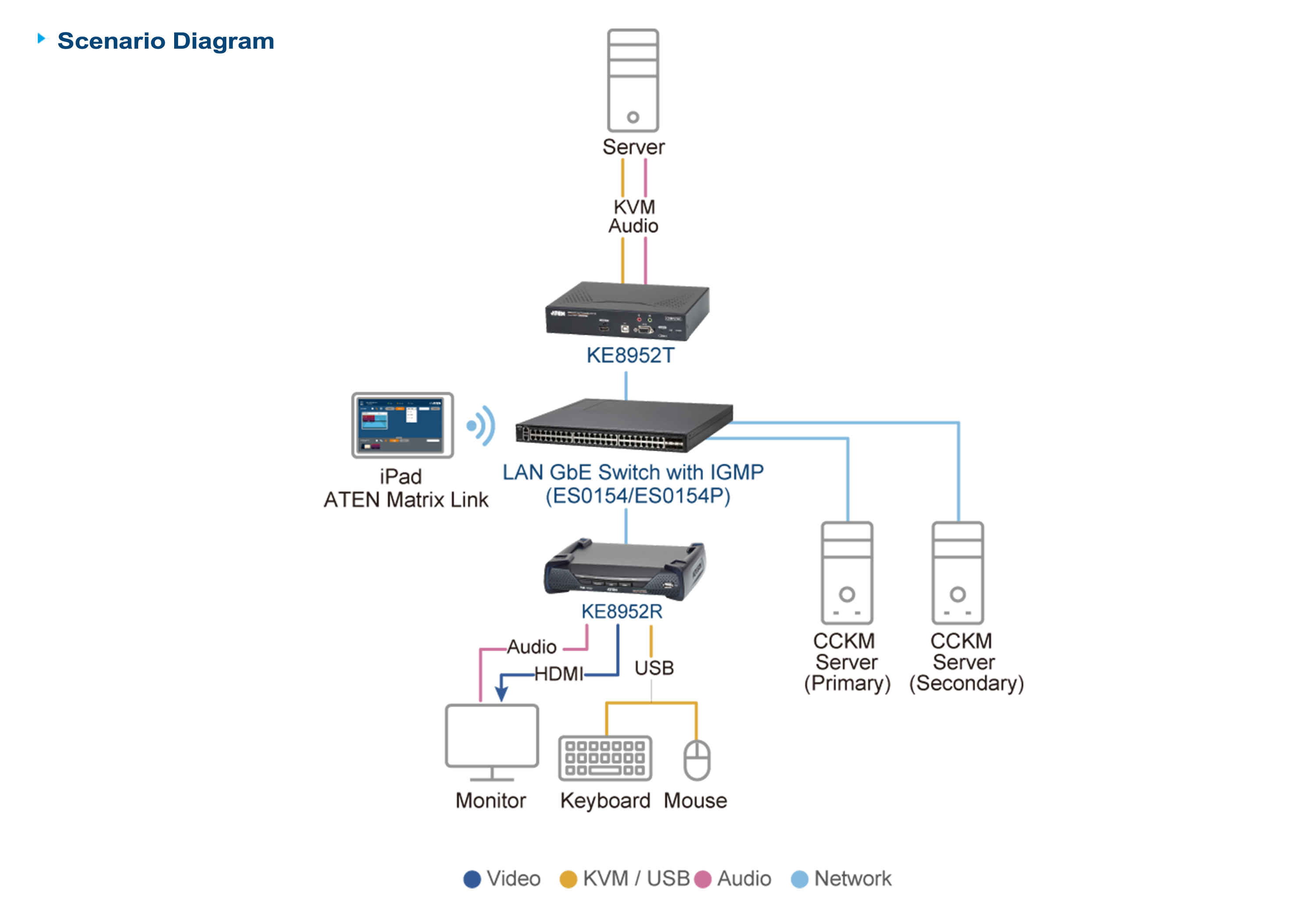 More flexible and efficient operations can be achieved in the KVM over IP Matrix System, which integrates KE Series Extenders with the KVM over IP Matrix Manager (CCKM), such as multi-display setups, video grouping, video profile scheduling and enhancements that give greater access to quick and easy control tools to configure KE devices over a network. Whether you're configuring, monitoring, administrating, controlling or extending computer access, the KVM over IP Matrix System is made adaptable, to fit an endless variety of working environments and workstation settings, as well as to provide solutions in broadcasting, control center, multimedia, manufacturing and many other industries where matrix extending is required.