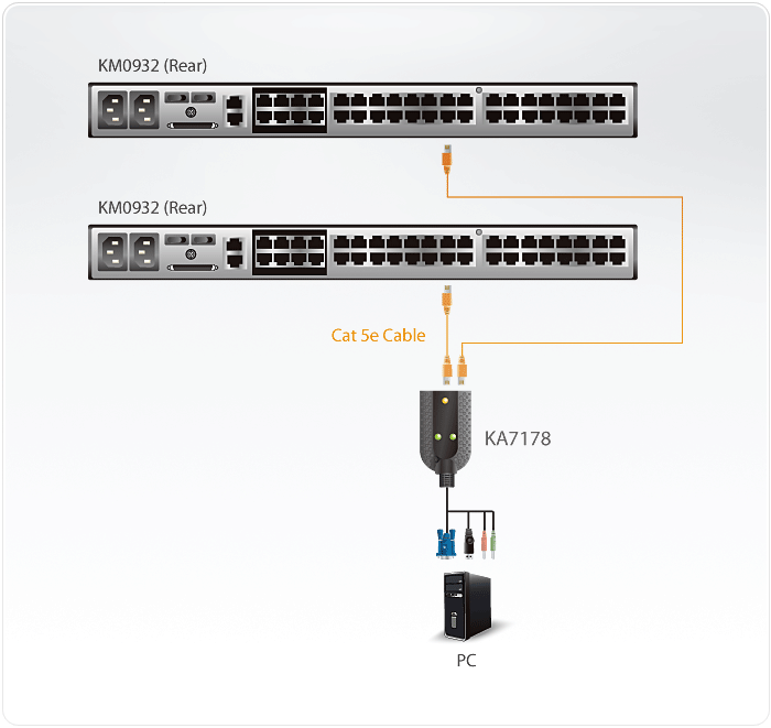 The KA7178 KVM Adapter Cable connects the KVM switch to the video, USB and audio ports of the target computer. In addition to Virtual Media support, it provides two Cat 5e/6 connectors, allowing a computer to connect to two ALTUSEN Matrix KVM switches. This allows consoles on different switches access to the same computer.