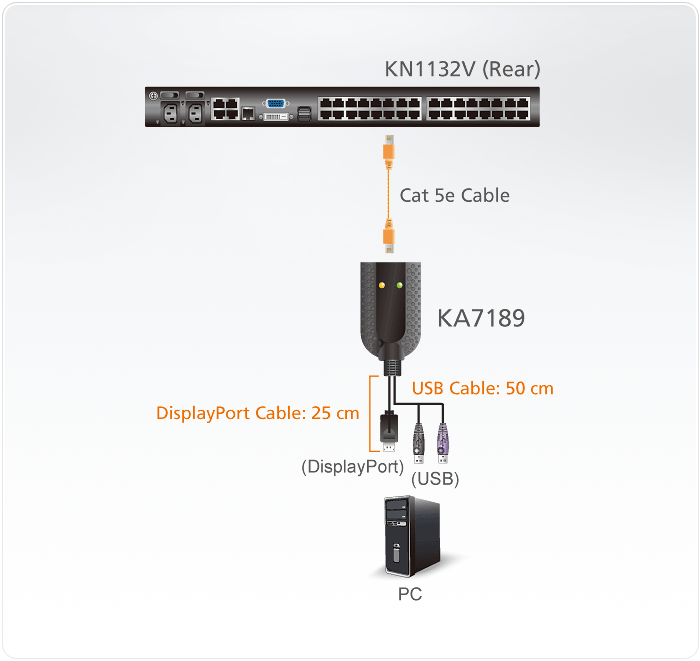 The KA7189 KVM Adapter Cable connects a KVM switch to the DisplayPort video and USB ports of a target computer.* The KA7189 supports DisplayPort output and provides two USB plugs to connect a target computer for keyboard/mouse, Virtual Media, or Smart Card/CAC Reader functions.**
