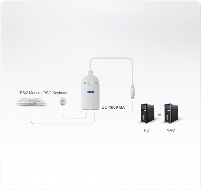 UC100KMA is a signal converter with a 30cm cable. It can convert signals of PS/2 devices (keyboard and mouse) into USB signals, and supports multiple operating systems to fulfill the needs of users.