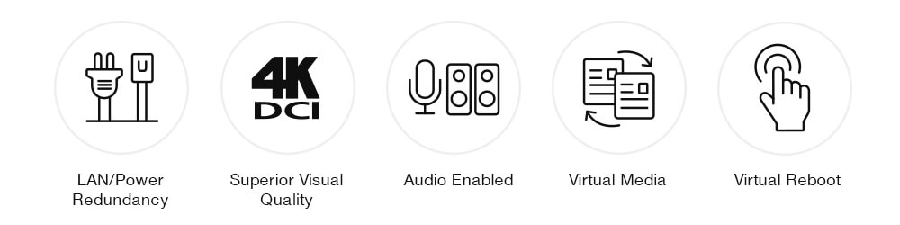 The CN9850 provides over-IP capability for remote access to a dedicated PC/server via a direct BIOS-level, hack-proof network connection, and expands on previous models with increased visual excellence, up to 4K DCI resolution, by utilizing an FPGA graphics processor. It allows for secured remote access to audio, video, and virtual media, facilitating instant file sharing and system updates over the network without the need for any extra software installation or configuration.
