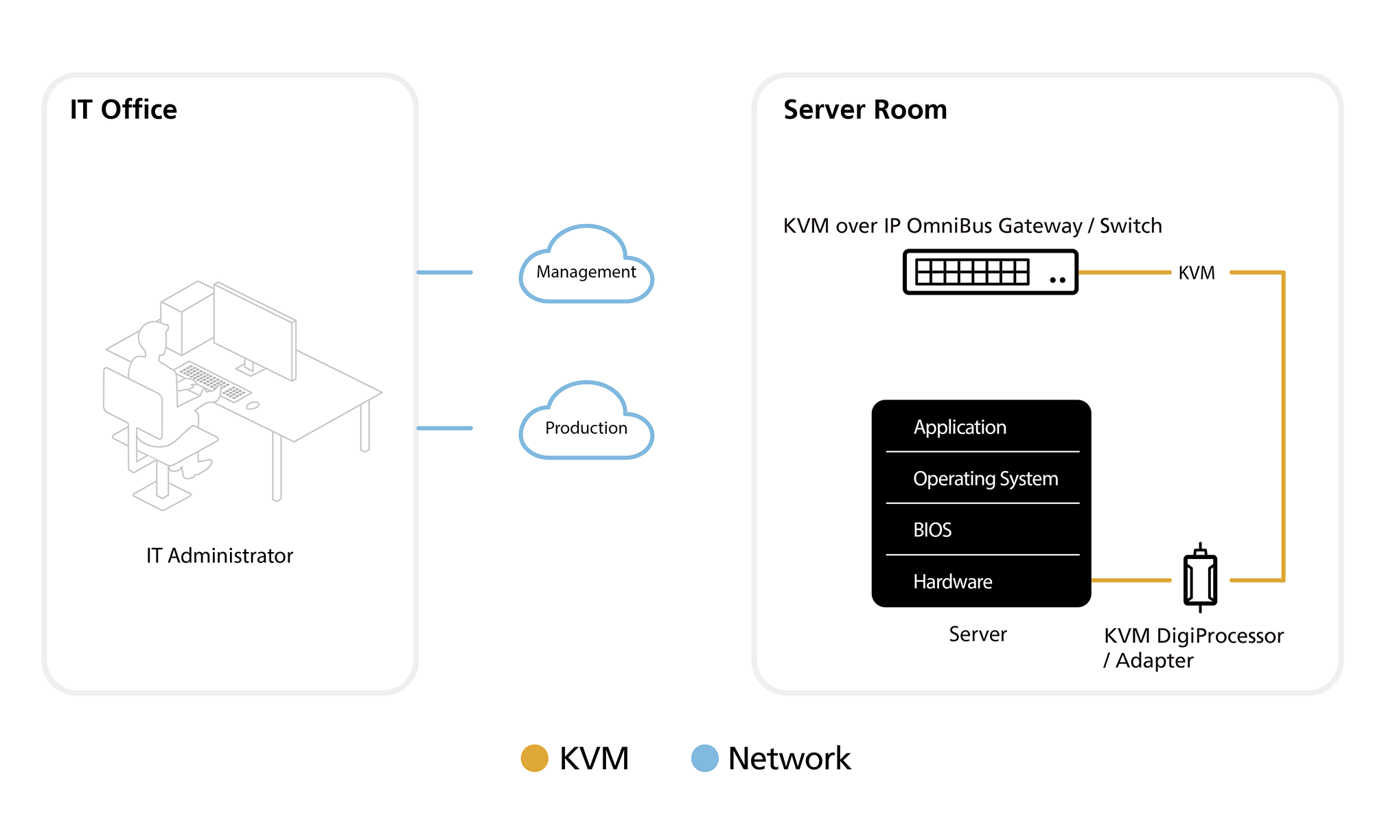 With the management network and production network separated, the KVM over IP OmniBus Gateway connected to the management network allows the IT operator to perform timely troubleshooting (e.g. software patches, image updates, reboots, etc.) and system maintenance over the servers via BIOS during the downtime of the production network. This approach can serve as an emergency measure in contingencies while keeping data and workflow secure from end to end.