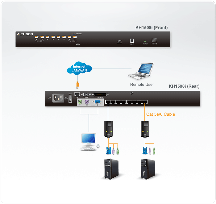 The KH1508i KVM Switche is control unit that allow access to multiple computers from a single KVM console. It uses TCP/IP for its communications protocol, it can be accessed from any computer on the Net - whether that computer is located down the hall, down the street, or half-way around the world.