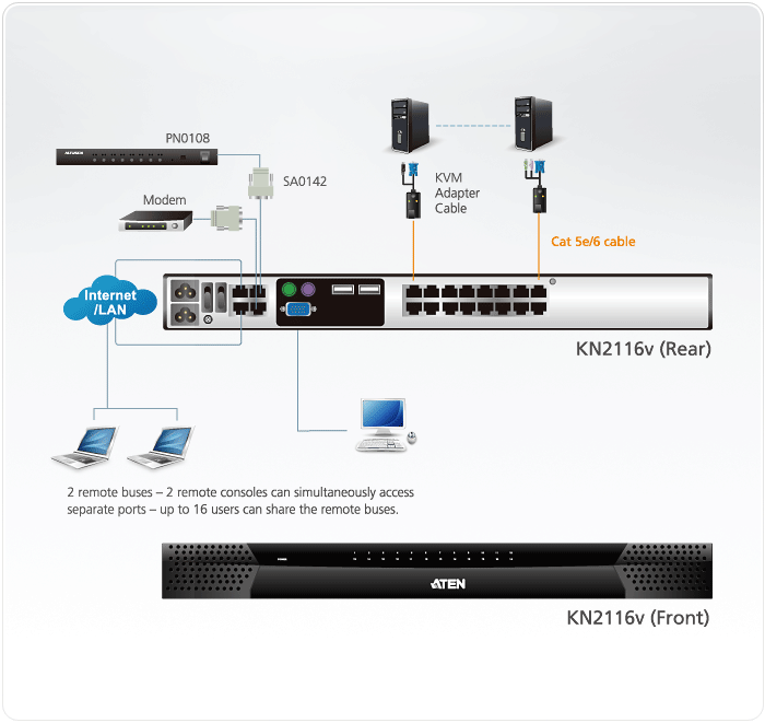 Aten´s new generation of KVM over IP switches - KN series allows local console access and remote over IP access for operators to monitor and access their entire data center over a network using a web-based browser. In addition, they offer out-of-band access with external modem support for BIOS-level troubleshooting when the network is down.