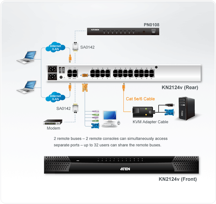 Aten´s new generation of KVM over IP switches - KN series allows local console access and remote over IP access for operators to monitor and access their entire data center over a network using a web-based browser. In addition, they offer out-of-band access with external modem support for BIOS-level troubleshooting when the network is down.