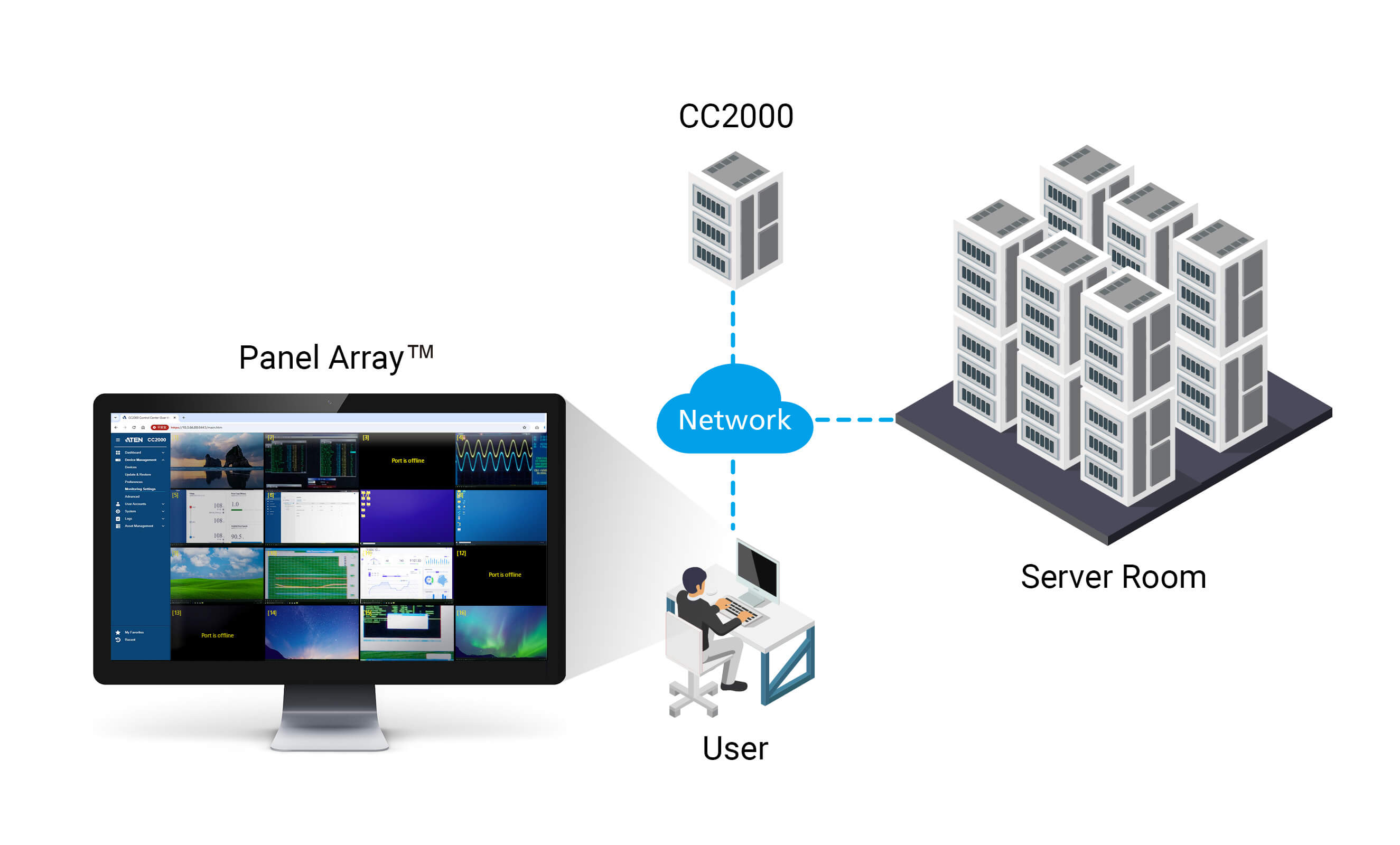 The CC2000's patented Panel Array mode lets administrators view the output of multiple ports in individual panels on the same screen. The panel configuration can combine the ports from different over-IP KVM devices and give administrators a flexible choice to select which devices they wish to monitor and how the ports appear on the screen. Ports can be accessed and managed simply by clicking on the panel it is displayed in.