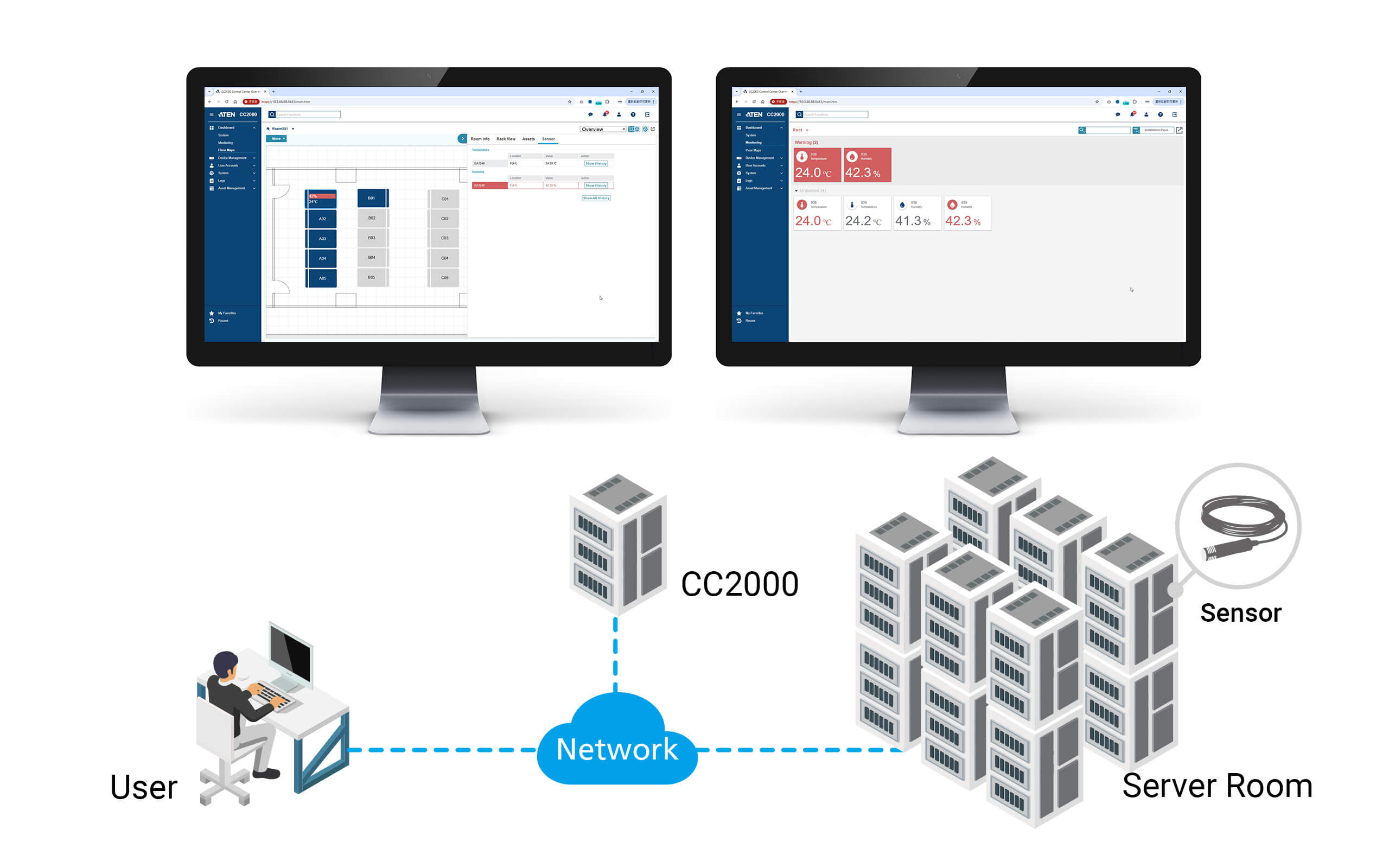 By integrating ATEN SN11XX series, PDU series and Energy Box, the CC2000 supports real-time environment and power monitoring. This allows users to recognize potential hot spots in racks, monitor power status of connected PDUs, and inspect other important info through the system dashboard, ensuring 24/7 availability of IP equipment.