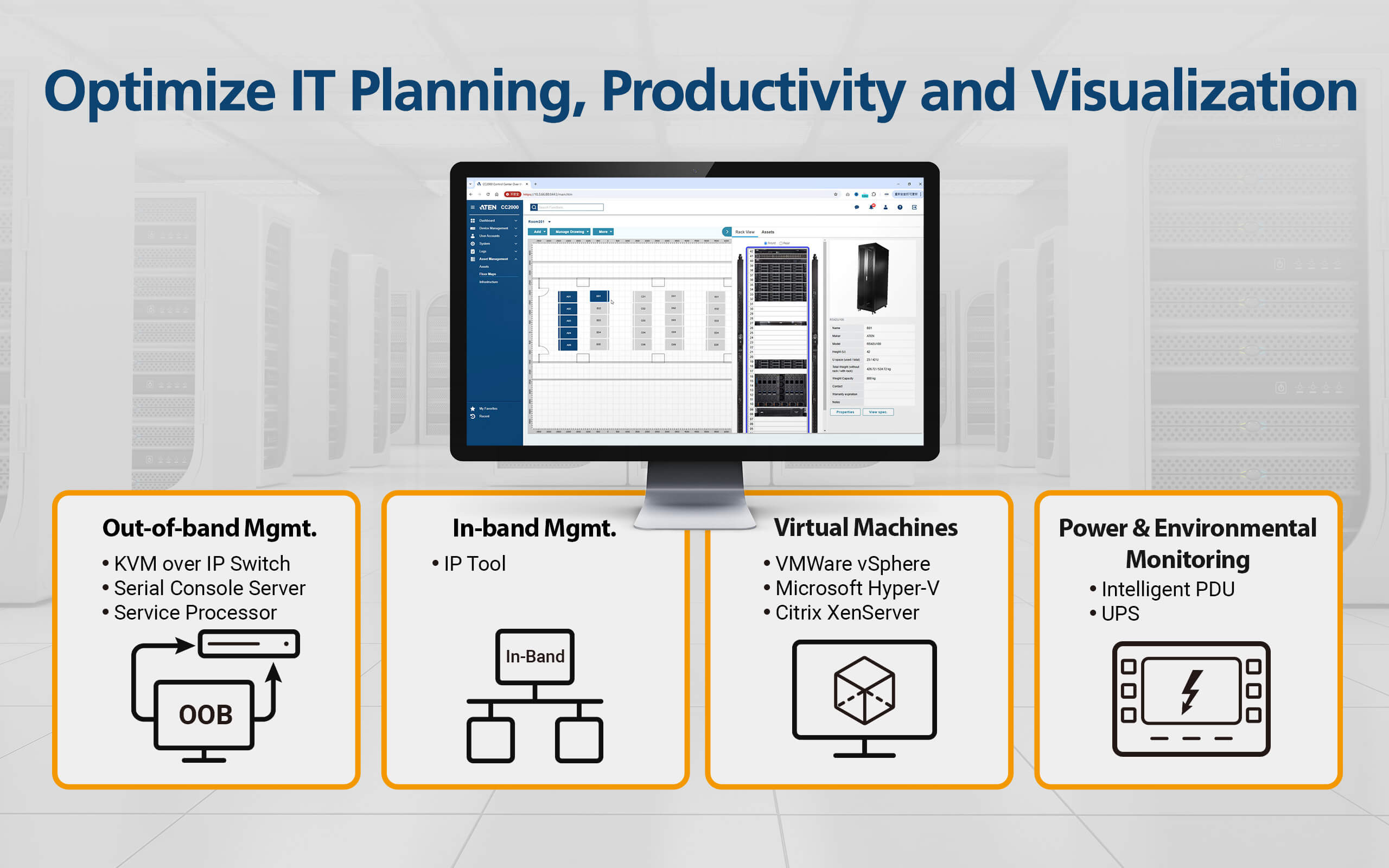 ATEN's CC2000 Centralized Management Software provides IT Teams in every industry with a comprehensive solution that enables central management of their IT infrastructure locally and worldwide through a single portal. The software consolidates the management of all ATEN KVM over IP switches, serial console servers, ATEN PDUs, UPSs, and third party devices such as embedded service processors, blade servers, and physical and virtual servers for in-band and out-of-band management. The brand new CC2000 provides an easy-to-use yet robust interface – making system management more efficient and productive.