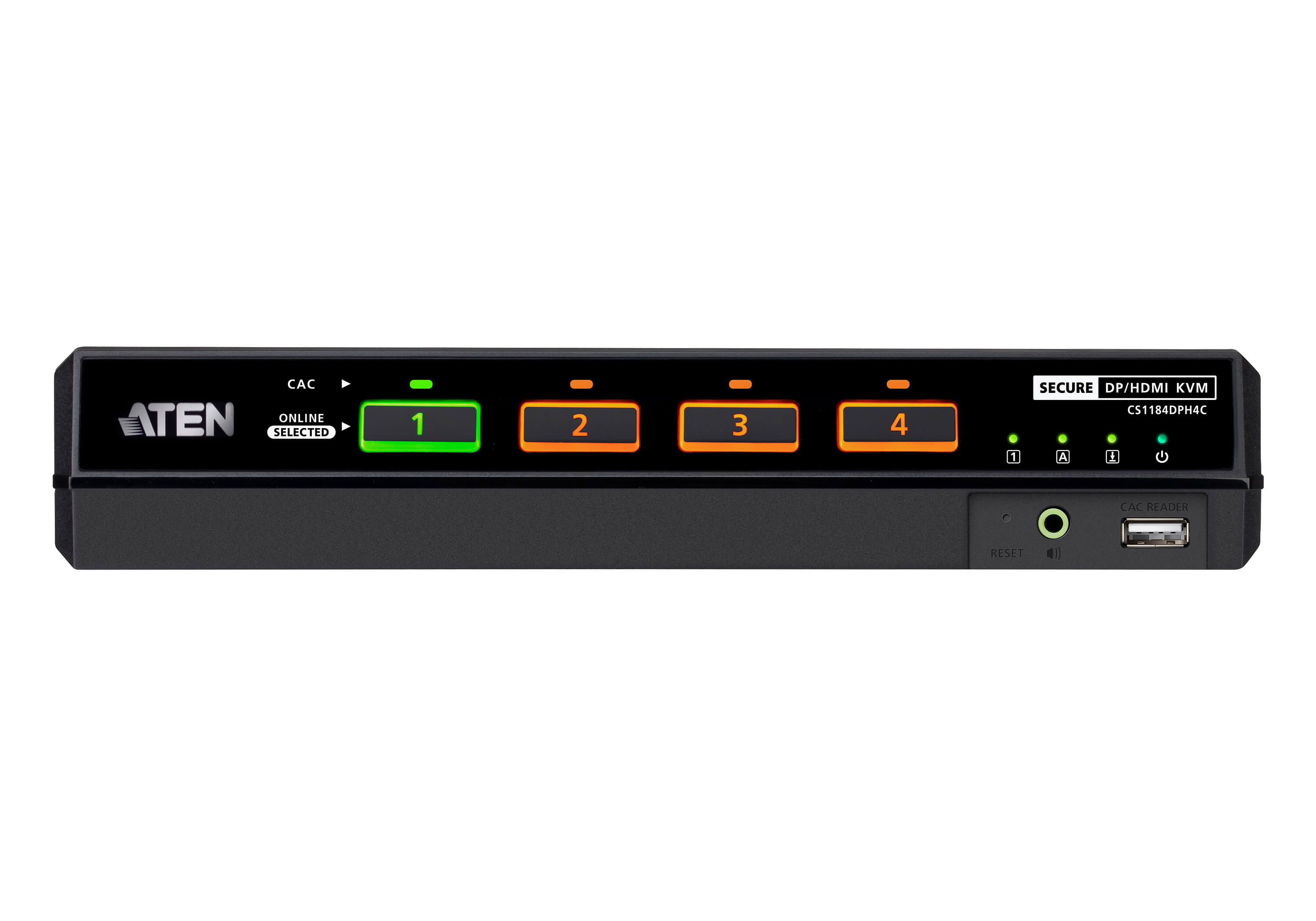 ATEN PSD PP v4.0 Universal Secure KVM Switch CS1184DPH4C provides isolation between computer sources and peripherals while sharing a single keyboard, mouse, monitor, speaker set, and Common Access Card (CAC) reader between connected computers of various security classifications. Compliance with PSD PP v4.0 ensures peripheral sharing capabilities provide maximum user data security when switching port focus, preventing unauthorized data flows or leakage between connected sources. Key protections include isolation and unidirectional data flow, restricted peripheral connectivity and filtering, user data protection, configurable device filtration and management, strict audio filtration, and always-on tamper-proof design, keeping sensitive assets isolated and providing advanced security and a user friendly design for instantly secure deployment.