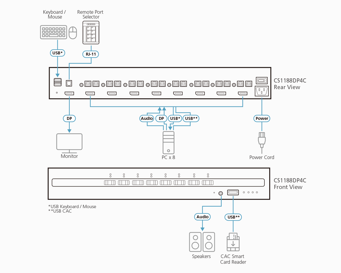 - 1x CS1188DP4C 8-Port USB DisplayPort Secure KVM Switch with CAC