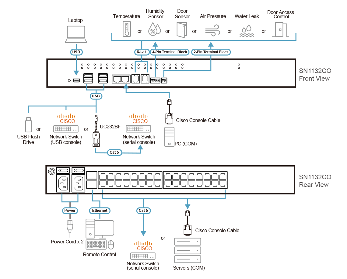 ATEN SN11xxCO Series (SN1116CO / SN1132CO / SN1148CO) serial console server provides IT and network administrators secure, out-of-band access to serial devices located at data centers or remote sites (such as network switches allowing console operation using RS-232 and USB console1). With dual power/SFP2 in the SN11xxCO models, all of them integrate cutting edge technologies to provide convenient installation, secure serial device access, easy management and comprehensive control for data centers.SN11xxCO series also supports USB 4G dongle3, for additional out-of-band network access.