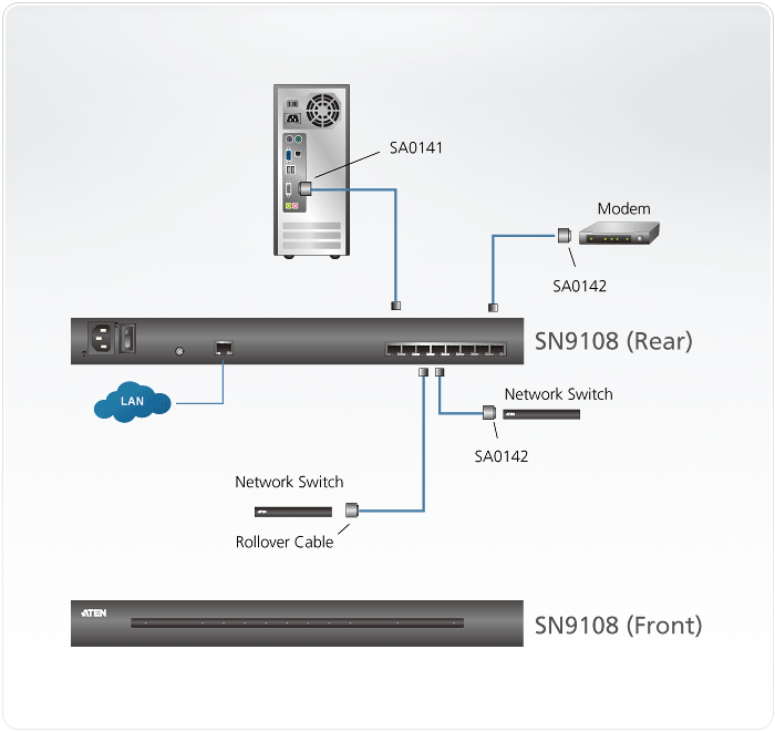 The SN series offers out-of-band (OOB) management that enables IT administrators to manage network devices (e.g. router, switch, UPS) in server rooms via management networks that are separate from the main/production networks. So if there’s difficulty in accessing the network devices through the production network, the administrators can still access them via the console server. The console server offers several out-of-band access methods, such as a direct console connection from a local computer, a USB console connection from a laptop, a PSTN connection via modem, or a dedicated management network connection via the Ethernet (LAN) port.
