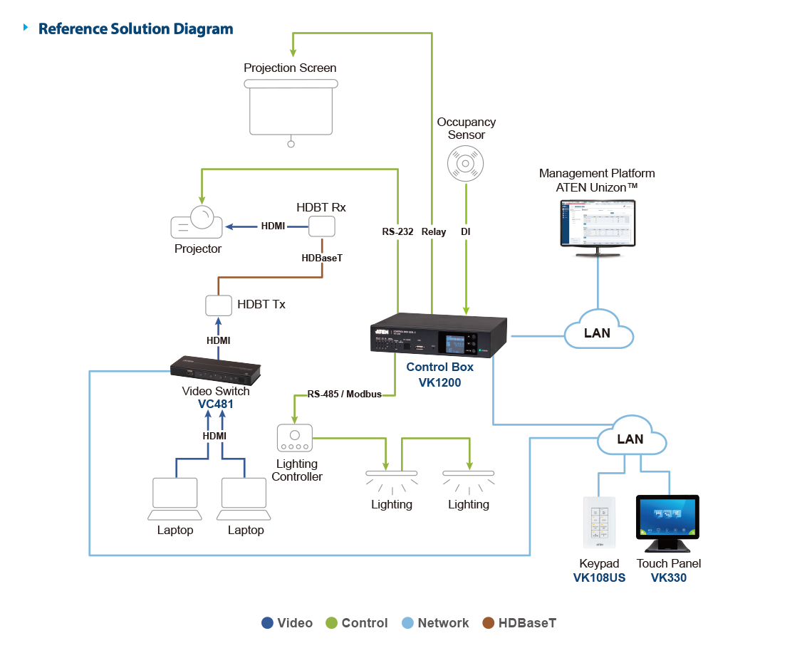 VK1200 is a part of ATEN’s Control System Series, a standard Ethernet-based management system, which consists of hardware, configurator software, control interfaces and related services, to control any hardware and software devices within a room setting, such as boardrooms and lecture halls, and to provide direct, centralized management effortlessly via user-defined GUIs from any mobile device, ATEN Keypad and Touch Panel.