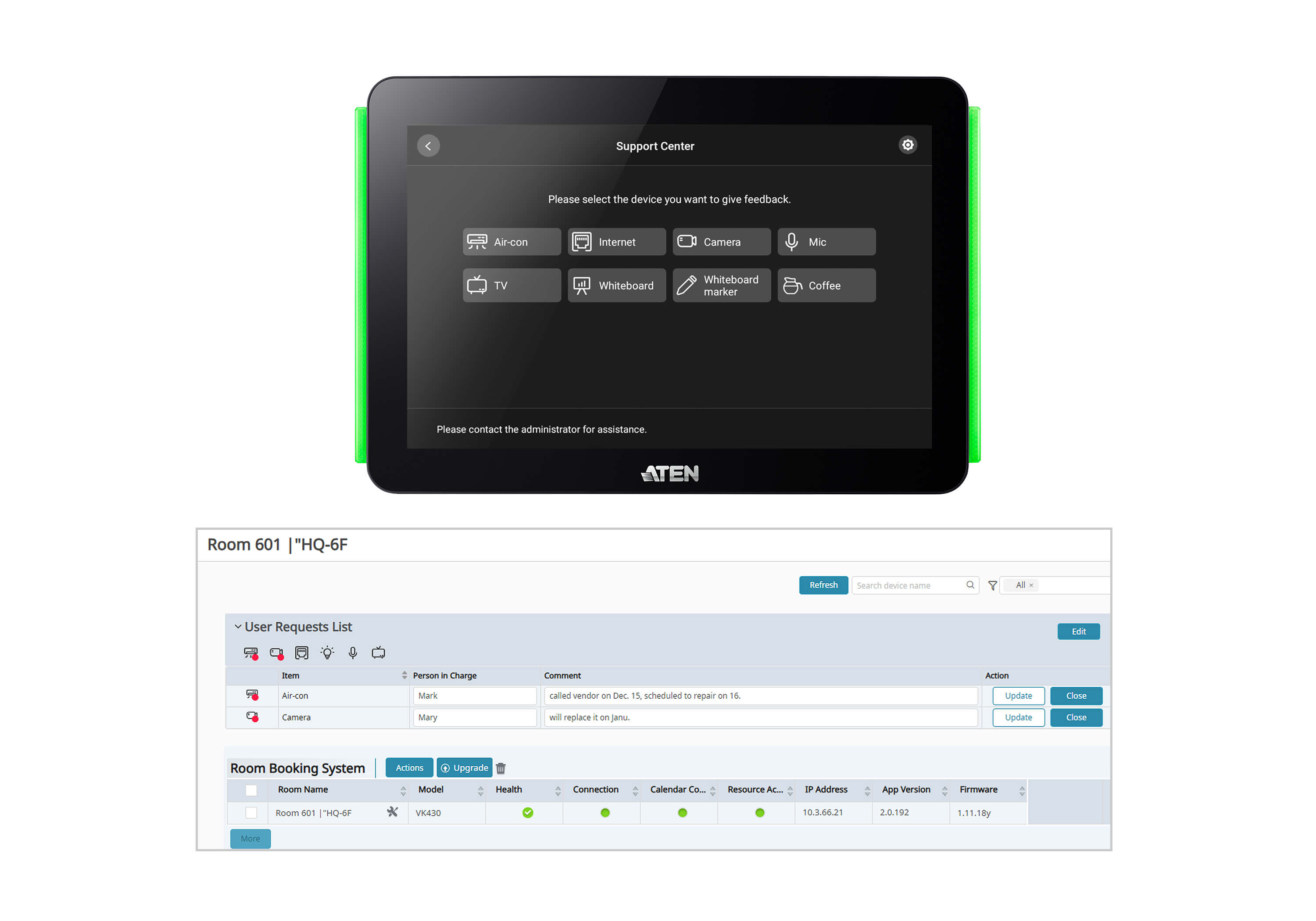 - Supports central management through ATEN Unizon to allow administrators to monitor managed devices in real time, generate room usage analyses, and update app in batch
