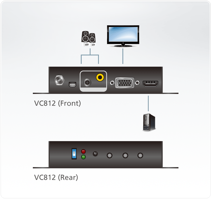The VC812 HDMI to VGA converter with Scaler offers an easy and convenient way of converting HDMI input signals into analog video (VGA). The VC812 carries a high-performing scaling engine that converts the video resolution to give you the best image quality.