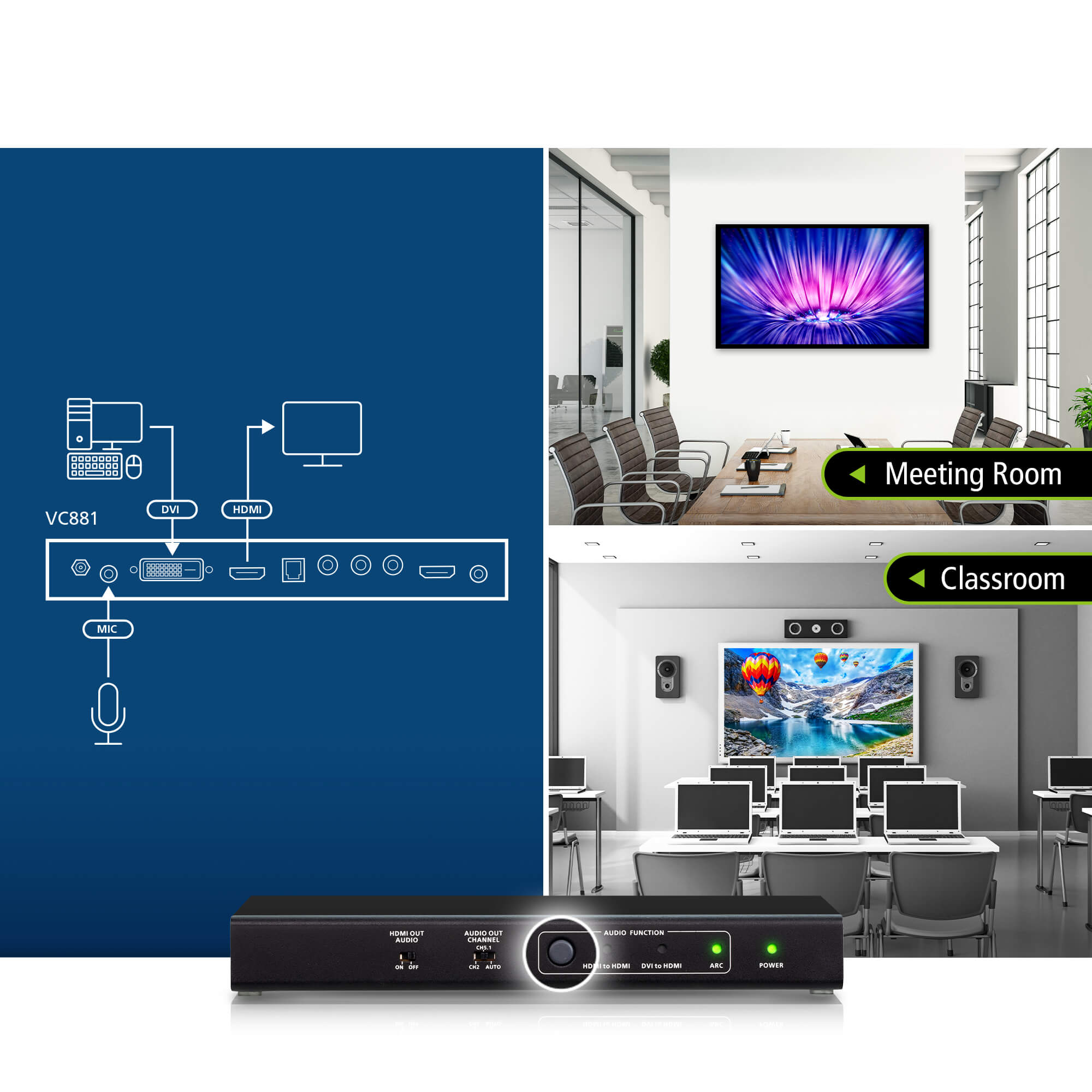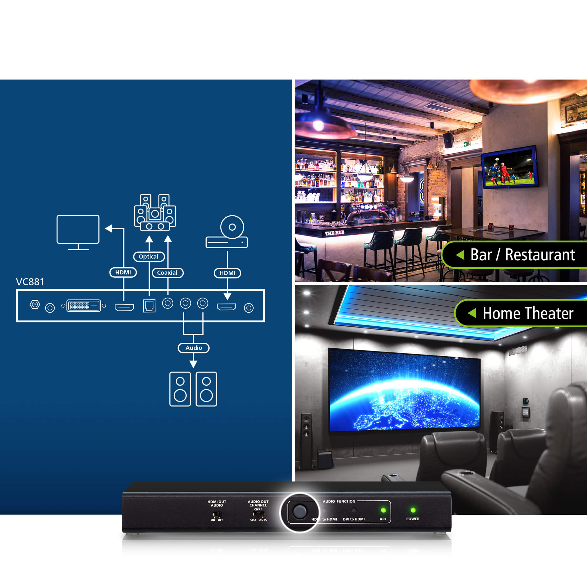 The compact enclosure design and audio de-embedding capability make the VC881 ideal for bars, public transportation stations, and home theater settings.