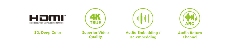 | Mode Selection | Side Switch x 1 (HDMI Audio Out - ON/OFF) Side Switch x 1 (Audio Out Channel - AUTO/CH 5.1/CH 2) Push Button x 1 (Audio Function Selection) 1. HDMI to HDMI 2. DVI to HDMI 3. ARC(Audio Return Channel) |