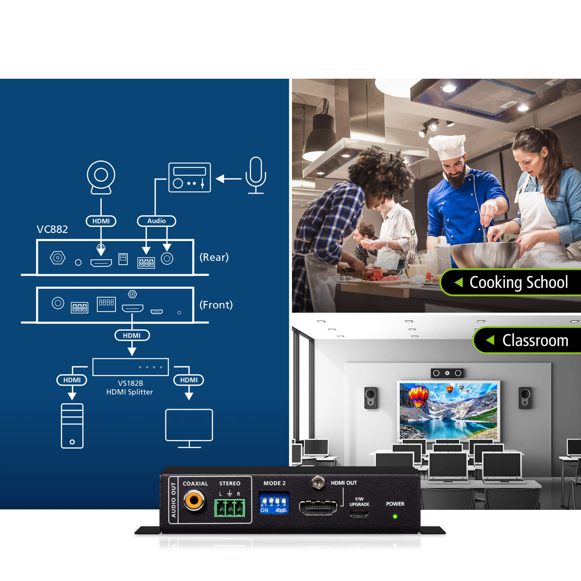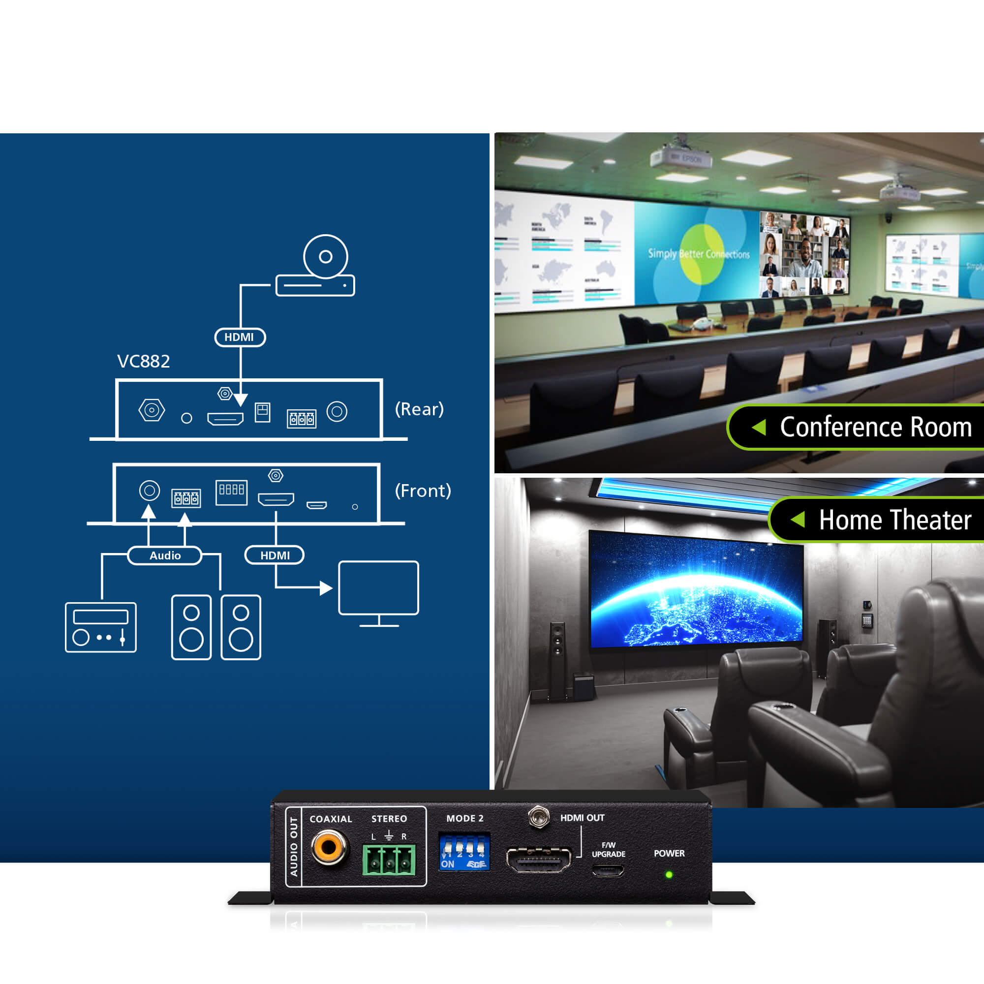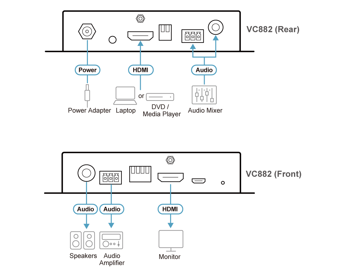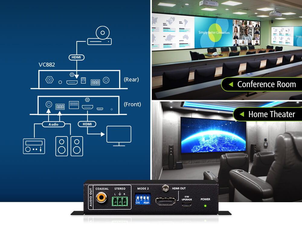 Experience superior sound quality in conference rooms or home theaters with the VC882’s audio de-embedding feature that separates the audio signal from the HDMI signal and outputs it to an amplifier or speaker.