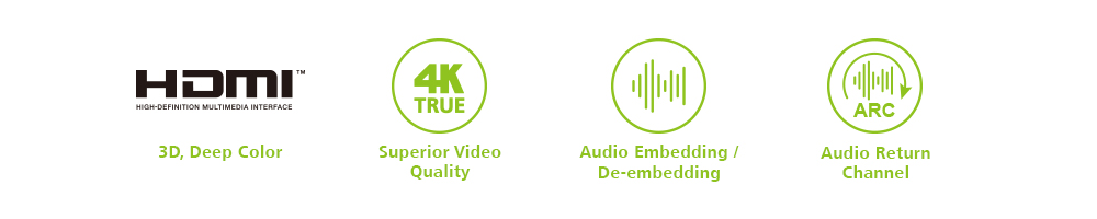 - Embeds audio to the HDMI output or de−embeds audio from the HDMI signal and outputs the extracted signal through an alternative audio system