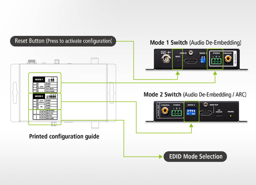Easily configure VC882 with the included printed setup guide that covers audio embed/de-embed, ARC, and EDID options for hassle-free setup.